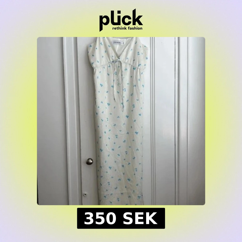 Superfin långklänning från Adoore i vit med små blå blommor. Klänningen har v-ringning, smala axelband och en söt knytning under bysten. Materialet känns lätt och luftigt, perfekt för varma dagar. Endast provad