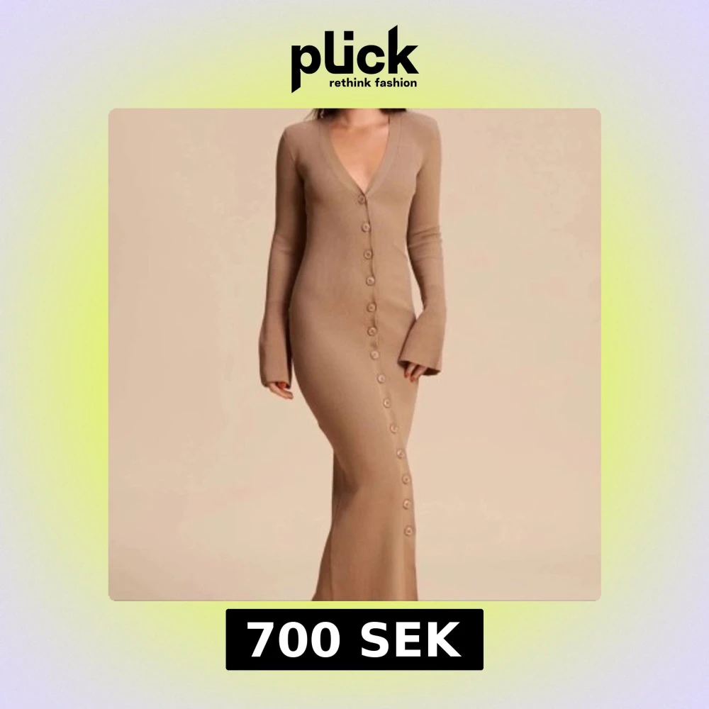 Snygg beige långklänning från Adoore med ribbad struktur och knappar hela vägen ner. Klänningen har en v-ringad design och långa ärmar med en elegant passform. Perfekt för en stilren look.