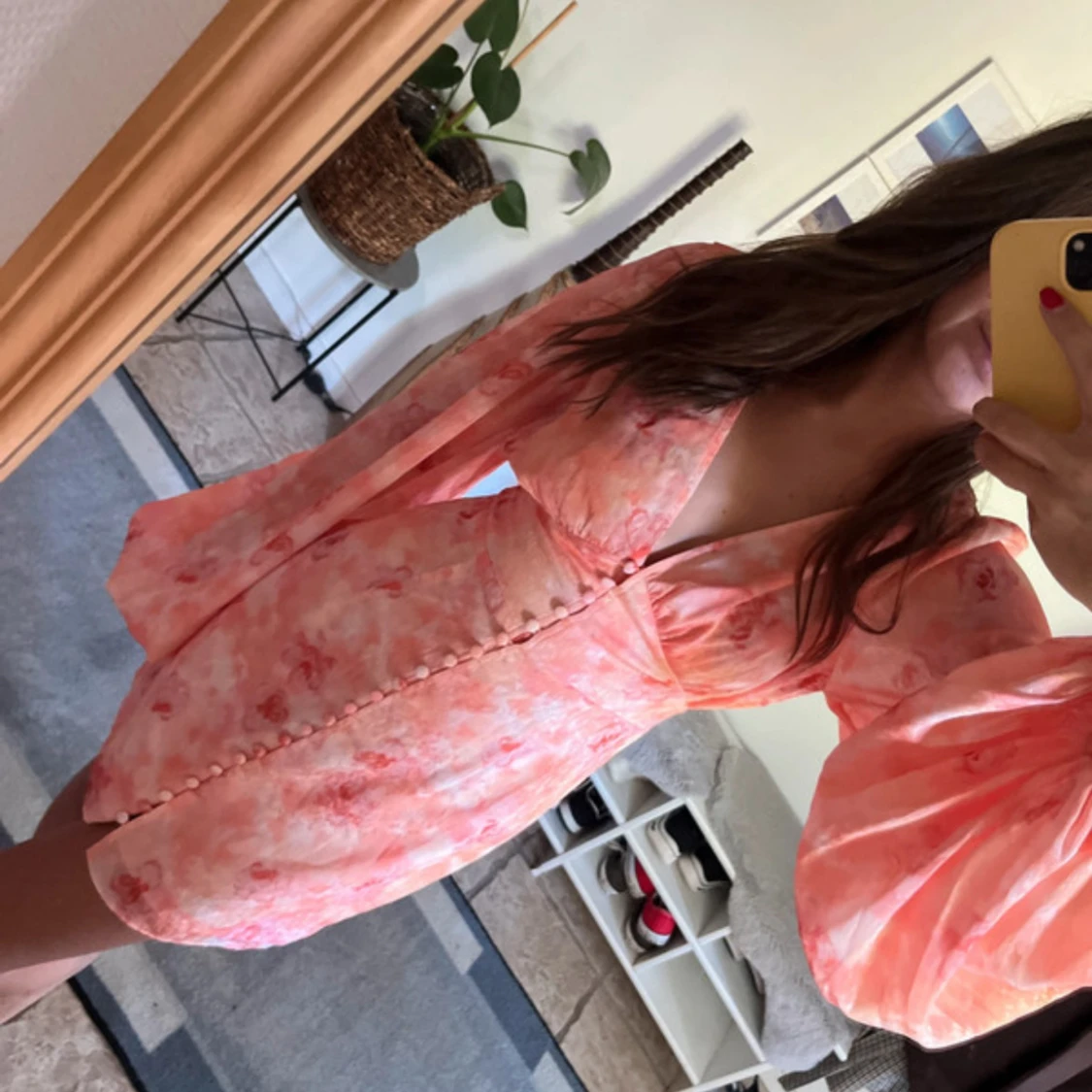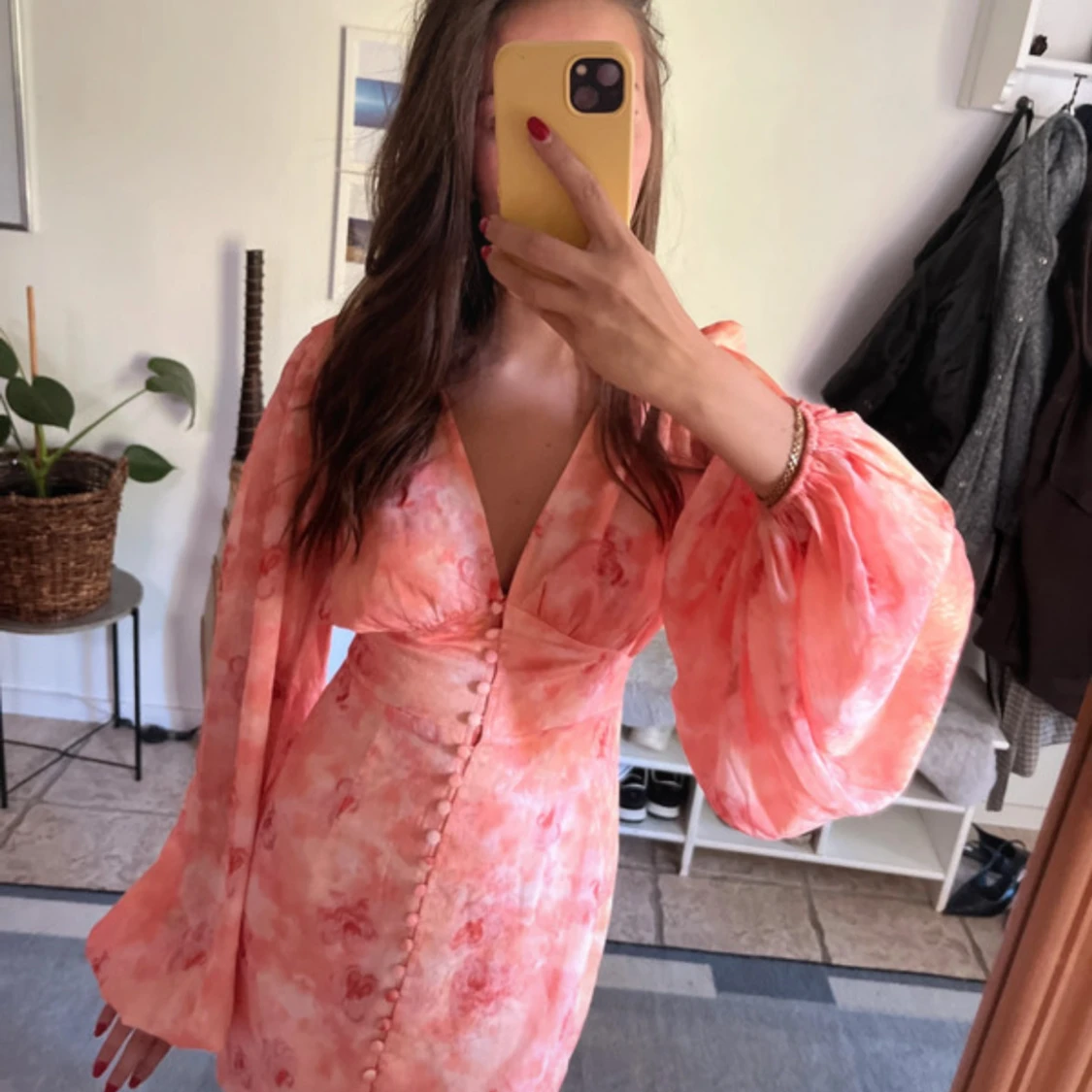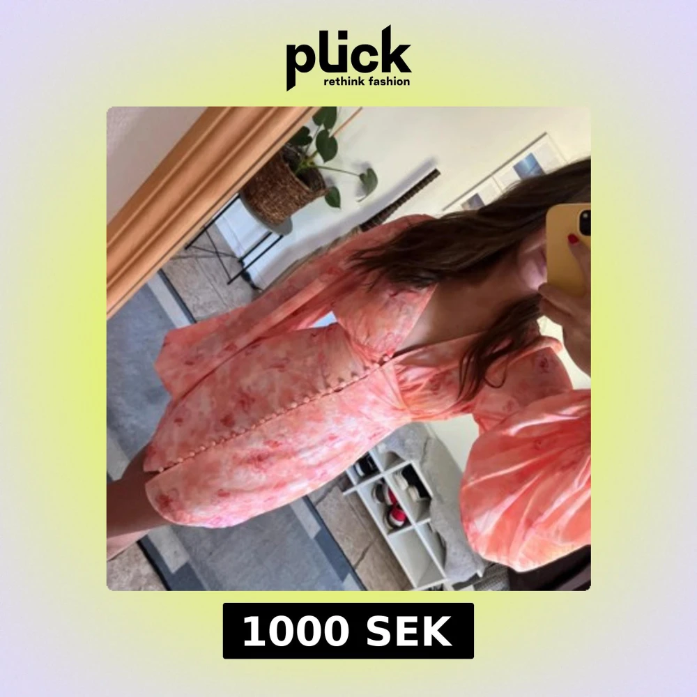 Superfin kortklänning i rosa och ljusa toner med blommigt mönster. Helt ny bara använt en gång! Djup v-ringning, markerad midja och knappar framtill. Klänningen har långa puffärmar som ger en romantisk vibe. Perfekt för sommarens alla tillfällen!