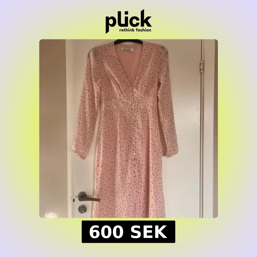 Supersöt ljusrosa långklänning från Adoore med små blommor, v-ringning och knappar framtill. Klänningen har lång ärm och markerad midja, perfekt för vår och sommar. Denna är aldrig använd.