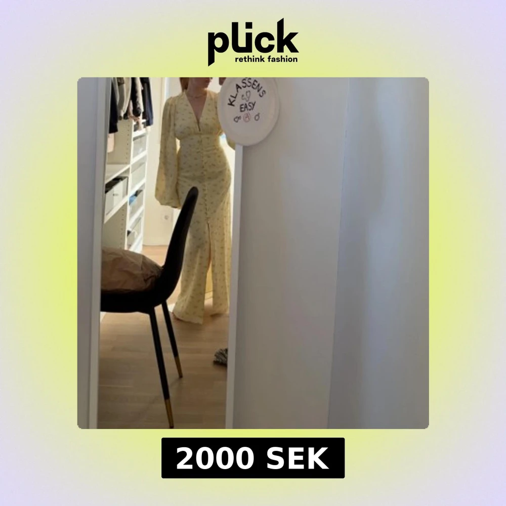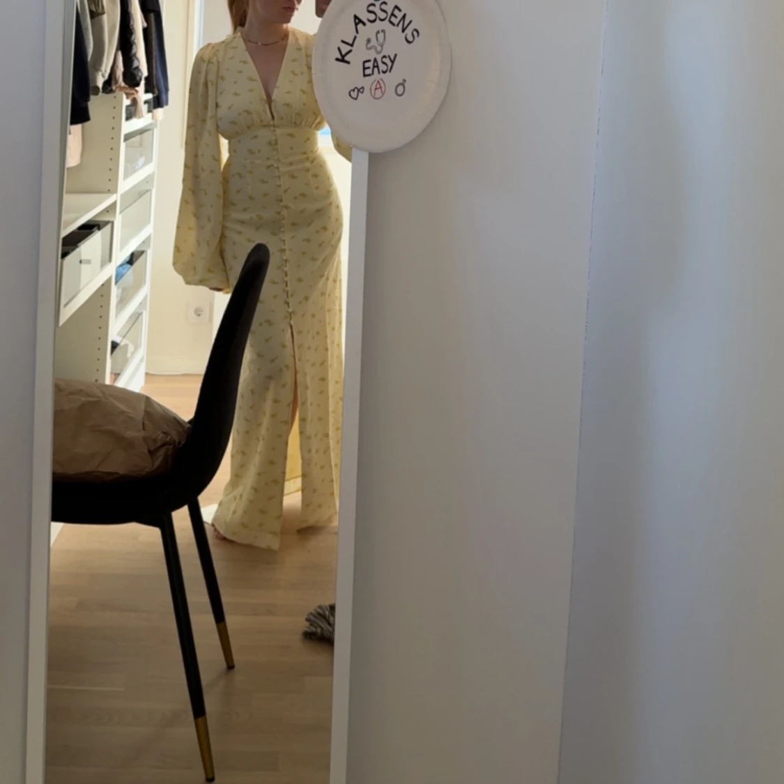 Superfin oanvänd långklänning från Adoore i pastellgul med små blommor, v-ringning och knappar framtill. Klänningen säljs inte längre i denna färg på hemsidan.