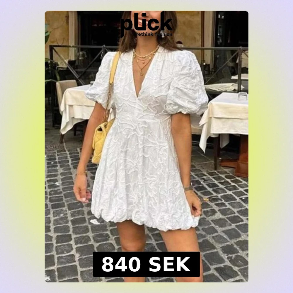 Säljer en vit kortklänning med puffiga kortärmar och v-ringad hals. Klänningen har ett broderat mönster över hela tyget. Perfekt för sommarens alla tillfällen!