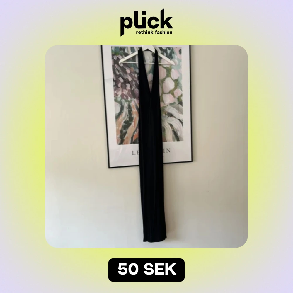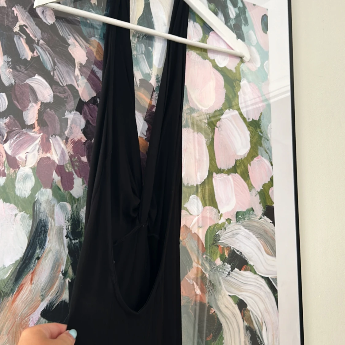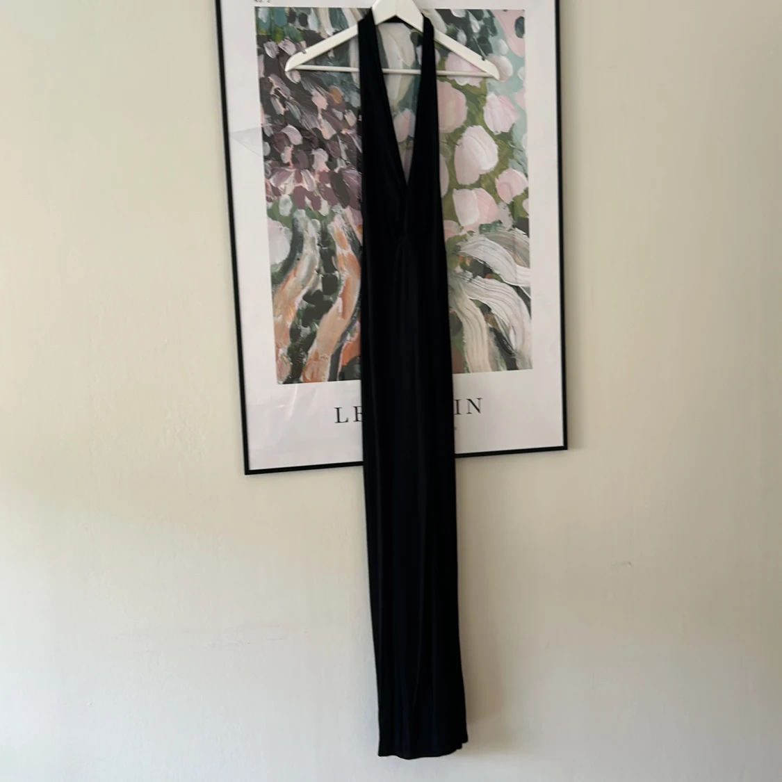 Svart aftonklänning i storlek 38. Halterneck och djup rygg. Oanvänd