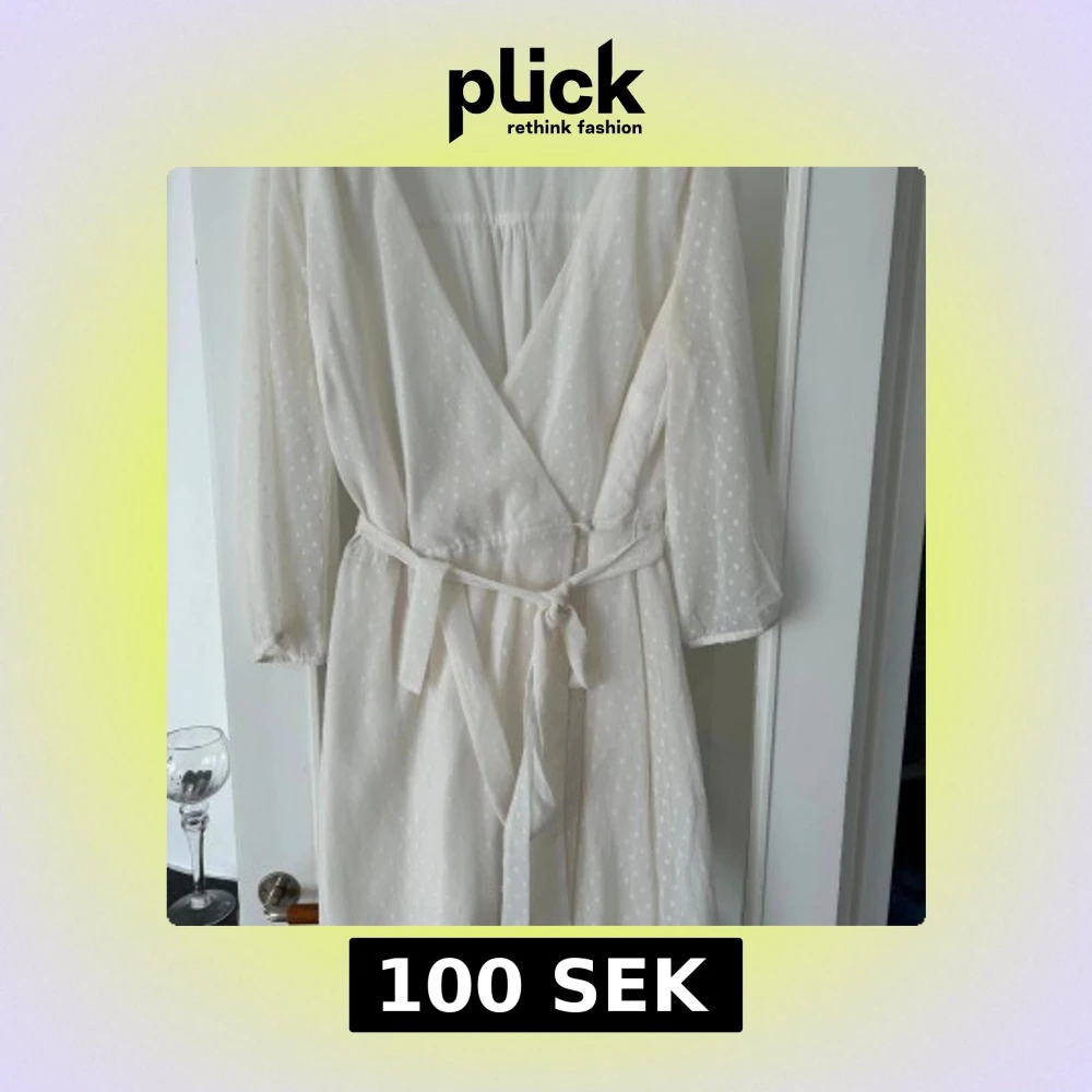 Säljer en elegant vit klänning med prickigt mönster och v-ringad design. Klänningen har trekvartsärmar och ett knytband i midjan för en smickrande passform. Perfekt för vår och sommar!