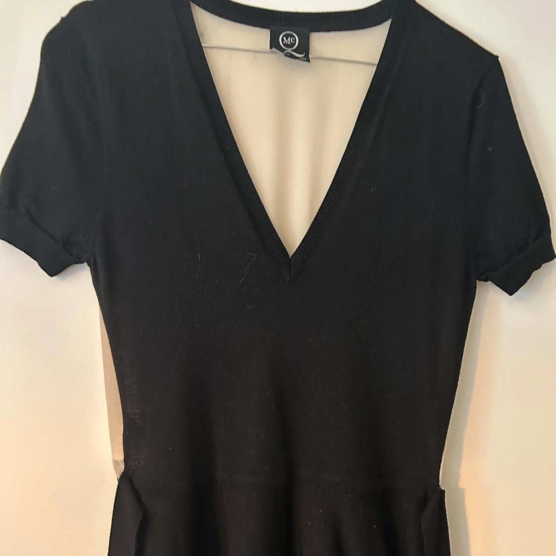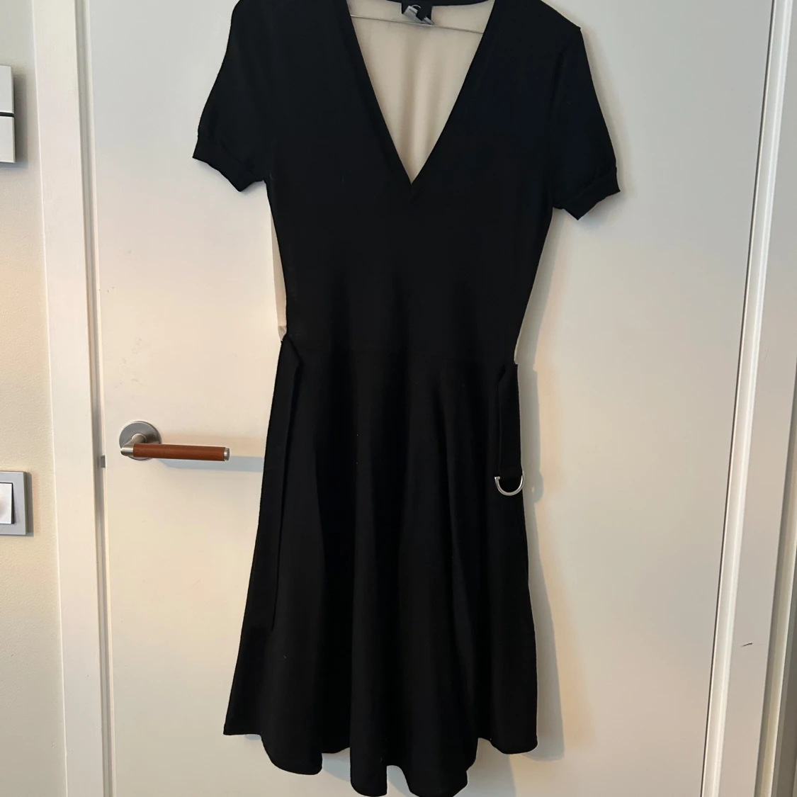 Svart kortklänning från Alexander McQueen med djup v-ringning, korta ärmar och en snygg detalj med metallring i midjan. Klänningen har en klassisk, lätt utställd siluett och är perfekt för dig som gillar stilren design med edge.