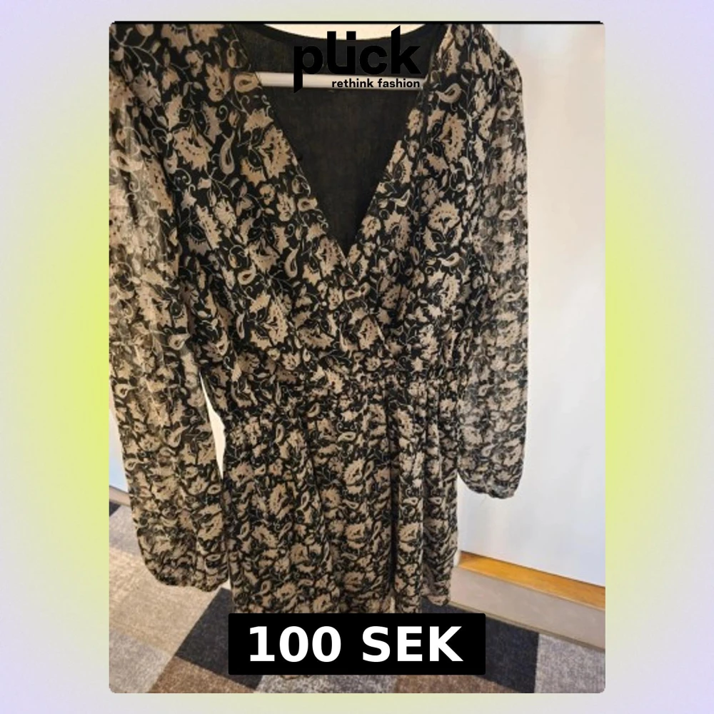 Snygg kortklänning från Amisu med svart botten och beige blommönster. Klänningen har v-ringad omlottfront, långa transparenta ärmar med resår vid handlederna och markerad midja. Tillverkad i lätt polyester som ger ett luftigt och flowy intryck.