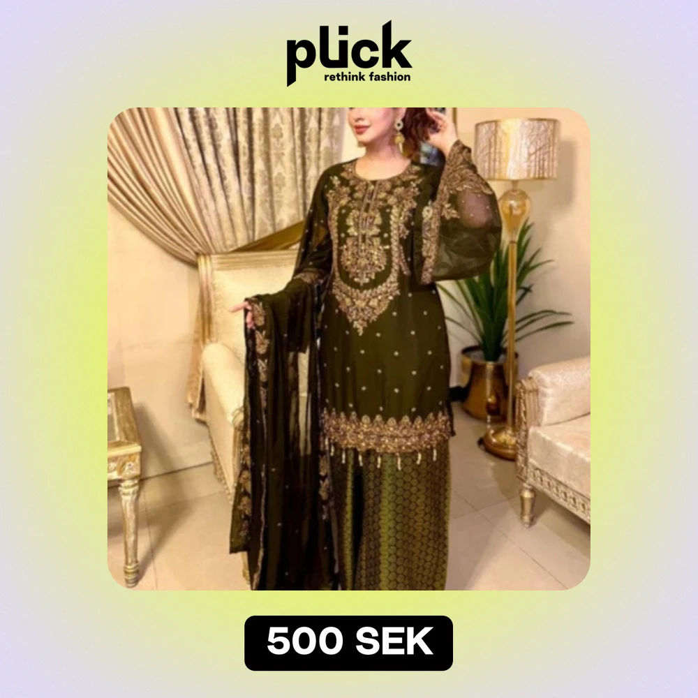 Pieces: 3 Piece -Top + Bottom + Dupatta.kai green a timeless ensemble that captivates with its exquisite hand embroidery adorning the neckline and the bottom of the shirt. The billowy sleeves add an enchanting allure to this ensembl