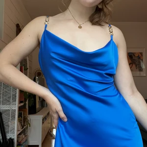 Vacker blå satinklänning i satin eller ” silke ” imitation. Aldrig använd och passar mig perfekt som vanligtvis är XS (storlek 34). Kan möta upp i Göteborg eller frakta :) helt ny med lapp. Köpt för ca 500:-