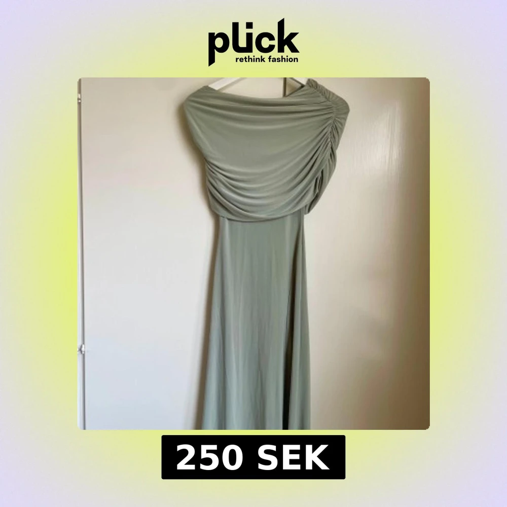 Snygg ljusgrön långklänning med en axel och draperad överdel. Klänningen har en elegant, flowy siluett och är tillverkad i ett mjukt, slätt material som faller fint. Perfekt för dig som vill sticka ut med en stilren och modern look. Oanvänd
