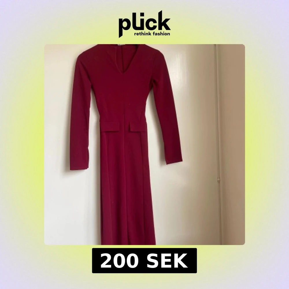 Säljer en elegant vinröd långklänning med v-ringad hals och långa ärmar. Klänningen har en figurnära passform och stilrena detaljer vid midjan. Från ASOS, använd två gånger.