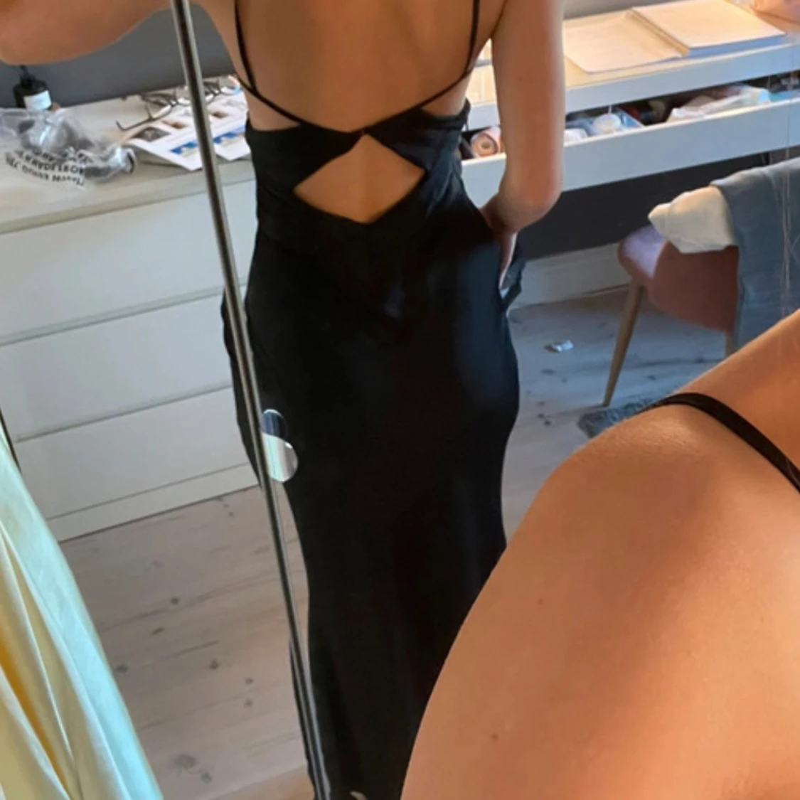 Snygg svart långklänning med en elegant öppen rygg och smala axelband. Klänningen har en tight passform och är perfekt för festliga tillfällen. Ny med prislapp