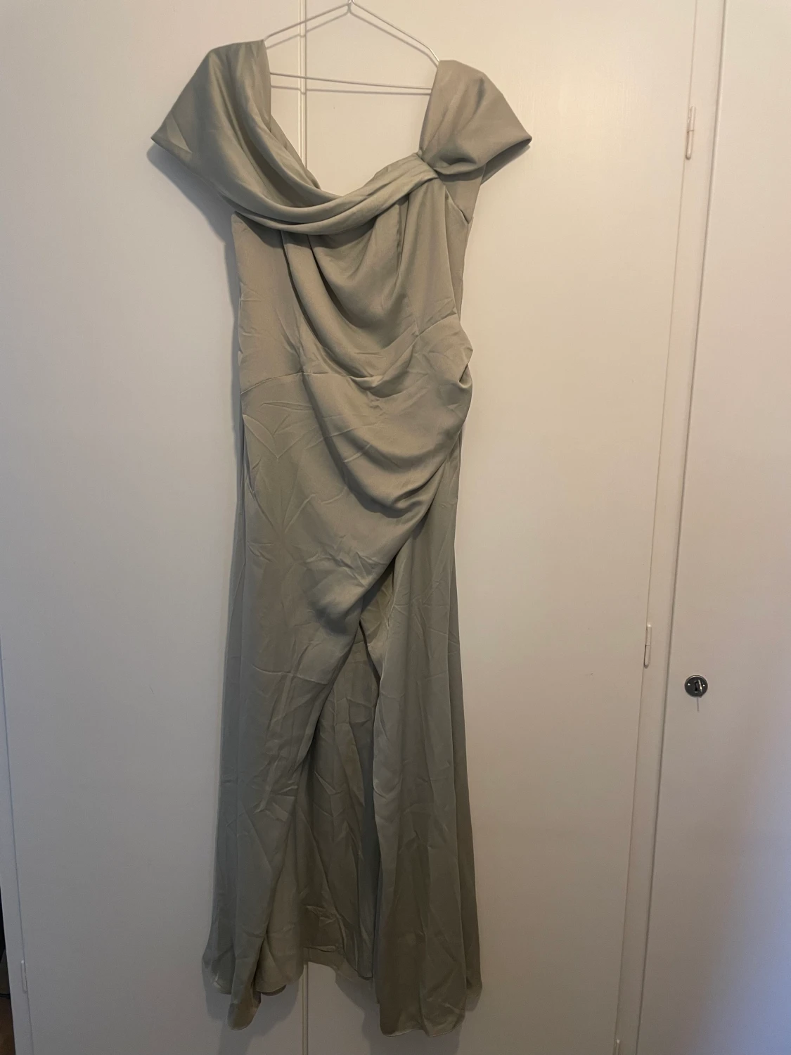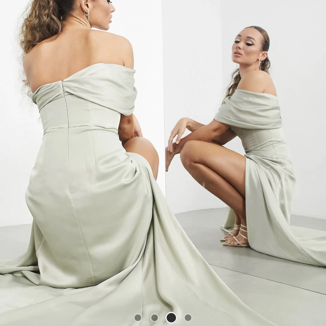 Oanvänd långklänning/ brudtärneklänning från Asos • Bardotringning • Dragkedja baktill • Omlottkjol • Lårhög slits • Regular fit/normal passform Färg: Sage green / Salvia grön Ordinarie pris: 1569 sek