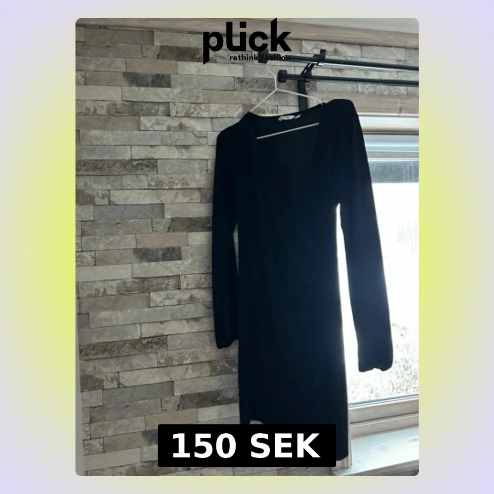 Säljer en svart kort omlottklänning från Aware med långa ärmar och snygg rynkning i sidan. Klänningen har en djup v-ringning och är gjord i ett mjukt, stretchigt material som sitter snyggt på kroppen.