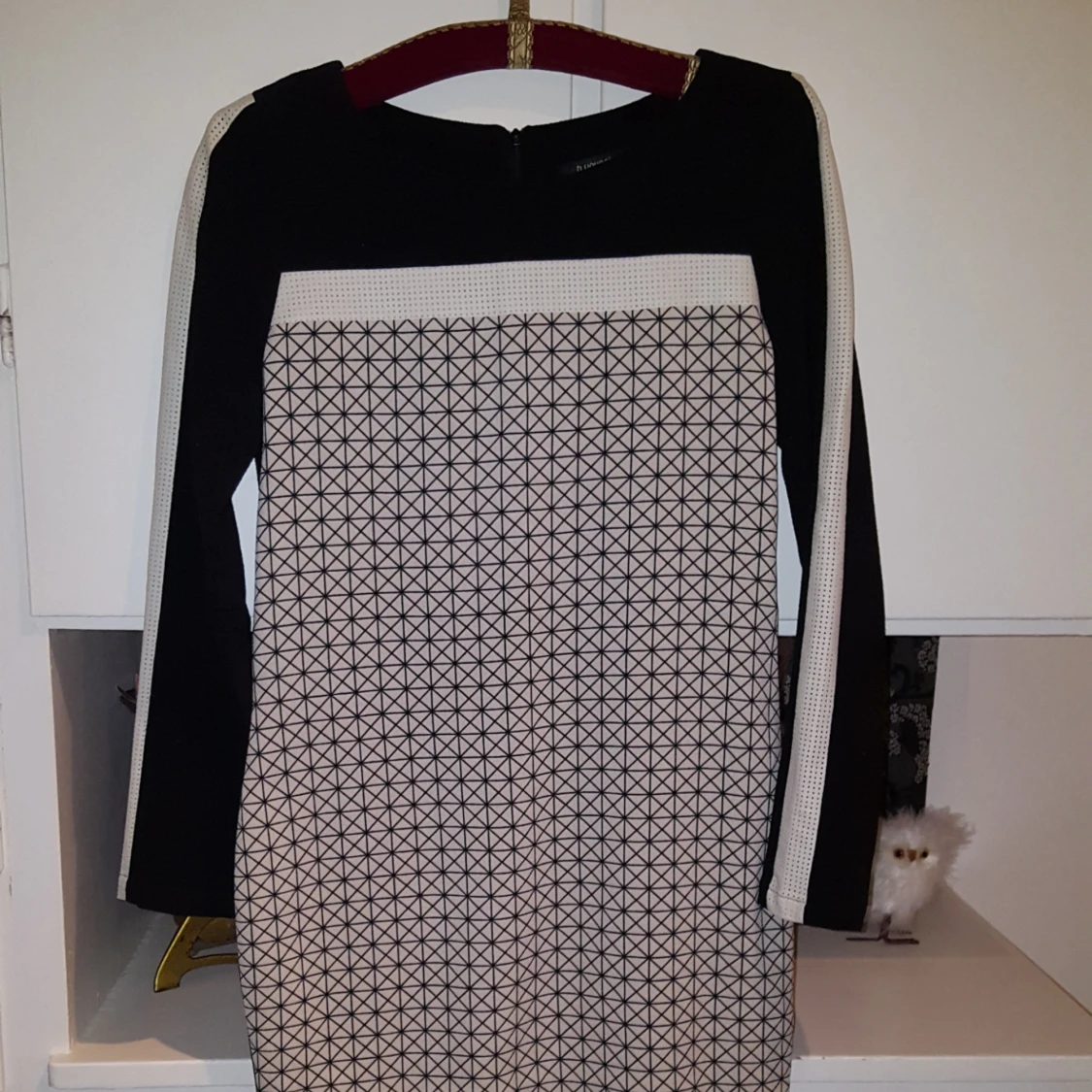 Långärmad klänning med "skinn" detaljer på ärmar och över bröstkorg. Riktigt bekväm och sitter fint. Slutar precis över knät. Använd 2 gånger