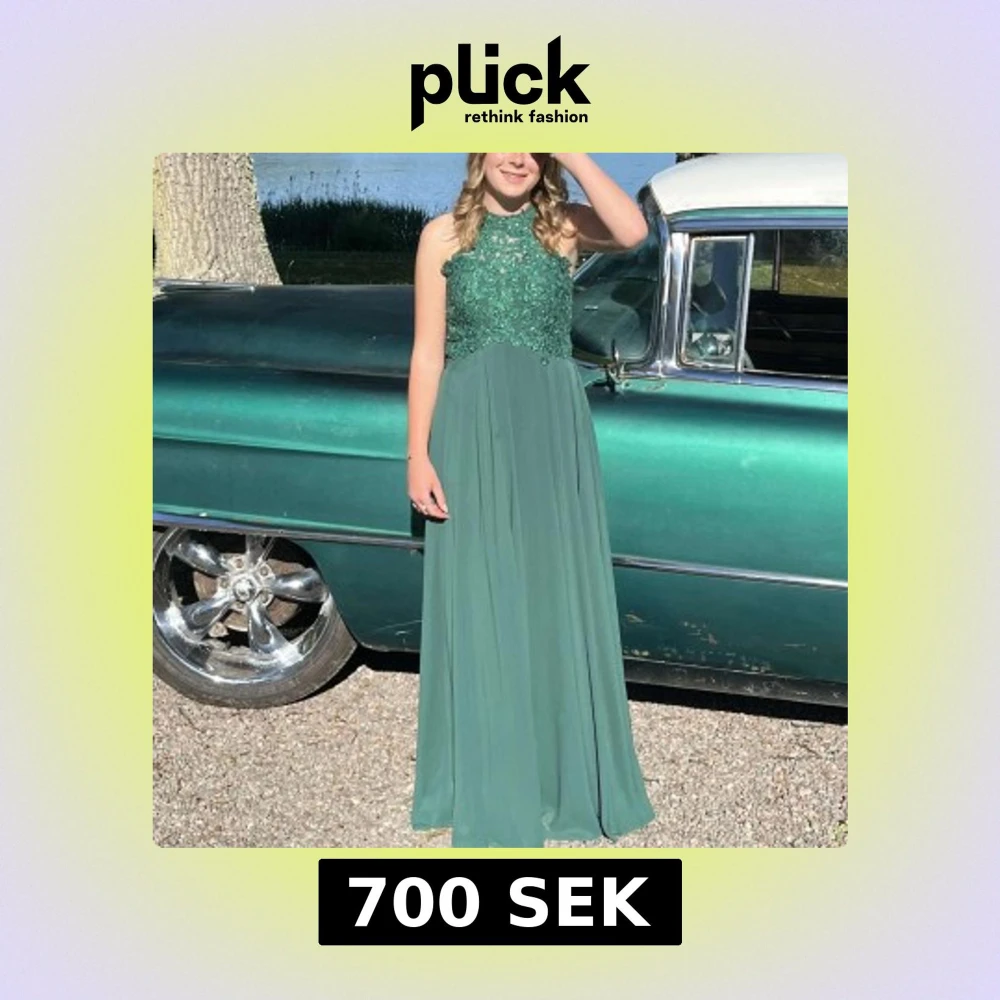 grön balklänning med spetsdetaljer på överdelen och en öppen rygg. Klänningen har en flytande kjol och är ärmlös. Den är använd en gång. Det står ingen storlek men passar mig som är storlek S.
