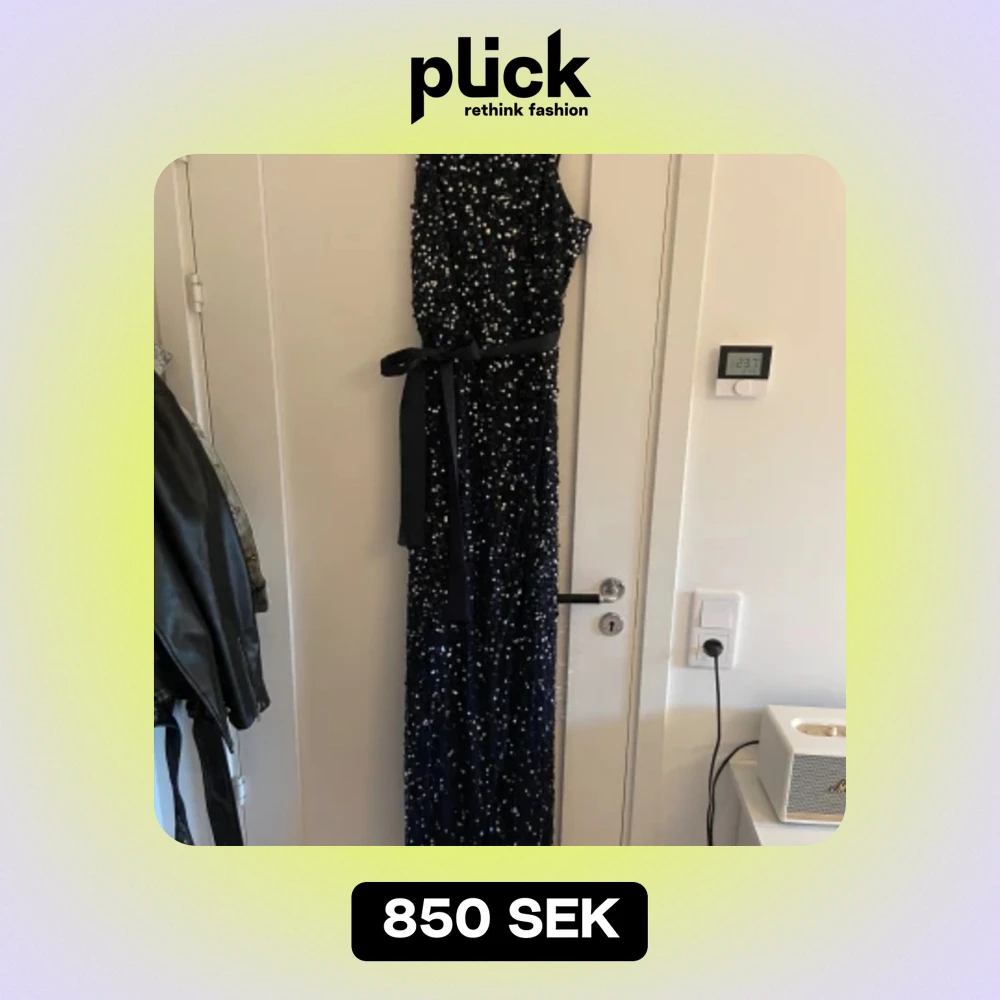 Otroligt vacker klänning i marinblå glitter den har siden band runt midjan och en slits som går en liten bit upp vid benet! använd 1 gång och är i nyskick.
