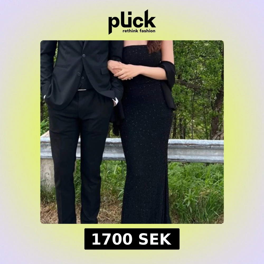 En jättefin svart pärlad balklänning från ohpolly med inbyggd ”korsett” vid överdelen, använd på balen 2024, absolut inget fel på klänningen, sitter väldigt bra och har ett fint släp, glittrar väldigt fint i ljuset. Satt bra på mig som oftast bär strl s (E kupa). Nypris 2500