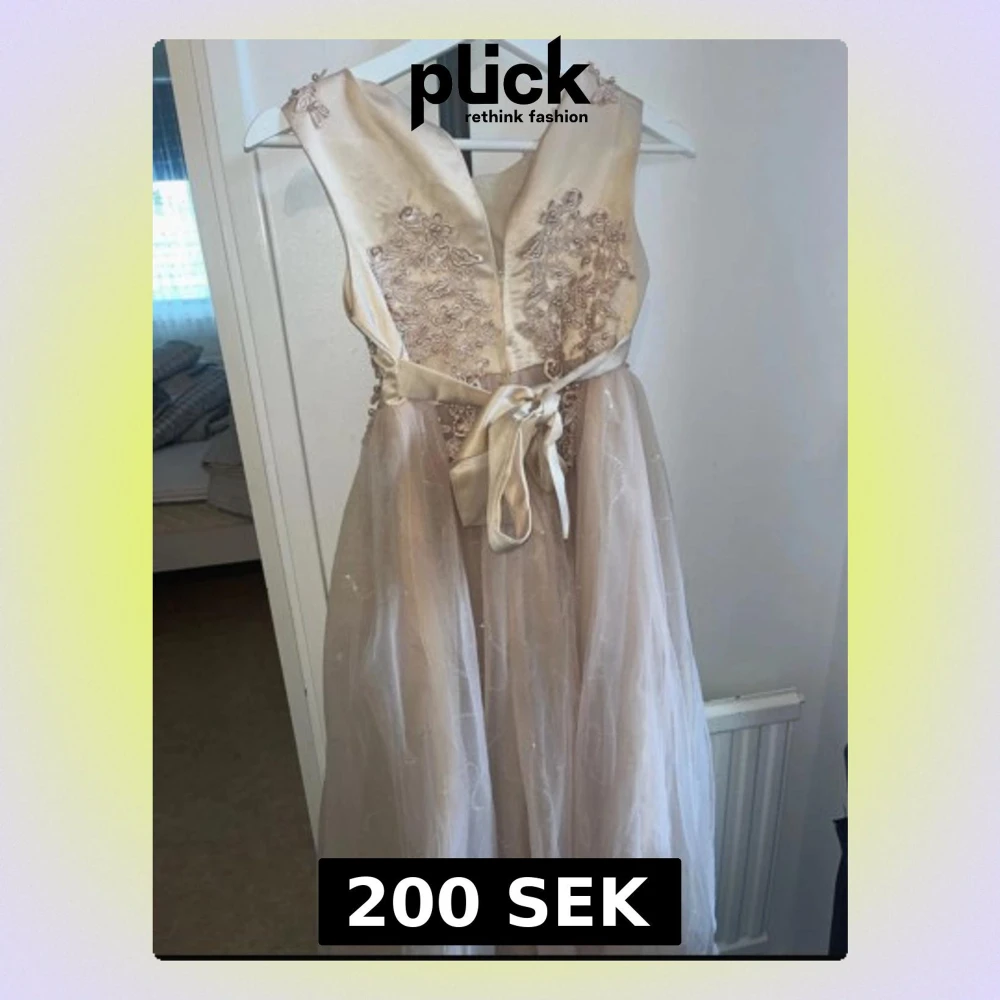 Elegant långklänning i champagnefärg med vackra broderade blommor och pärldetaljer på livet. Klänningen har ett satinliknande överdel, markerad midja med knytband och ett voluminöst tyllkjol. Perfekt för bal eller speciella tillfällen.