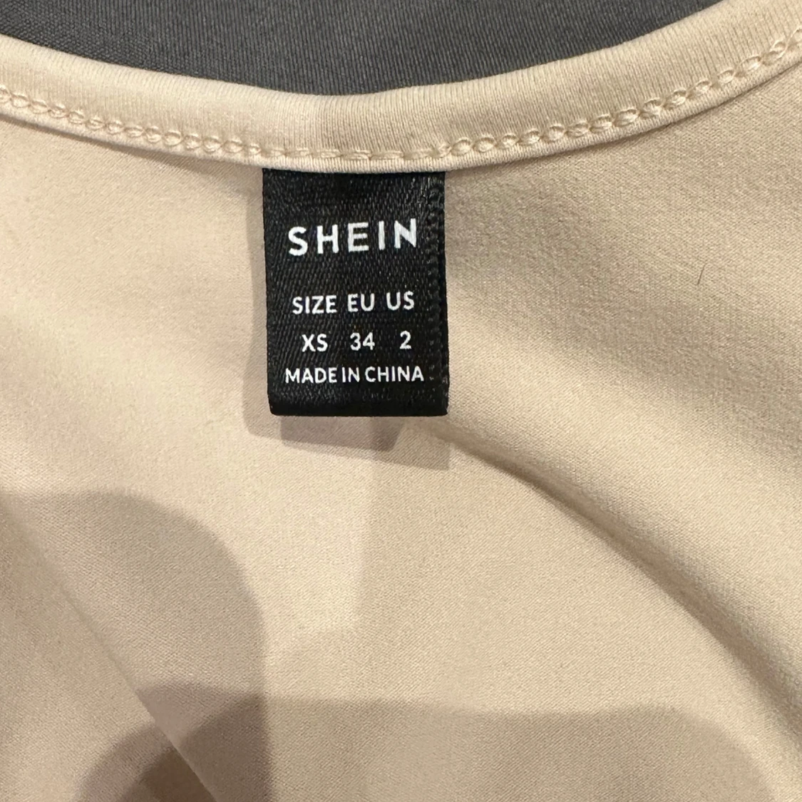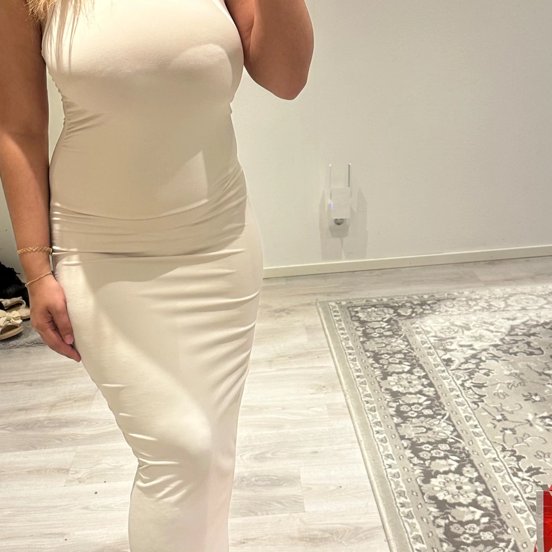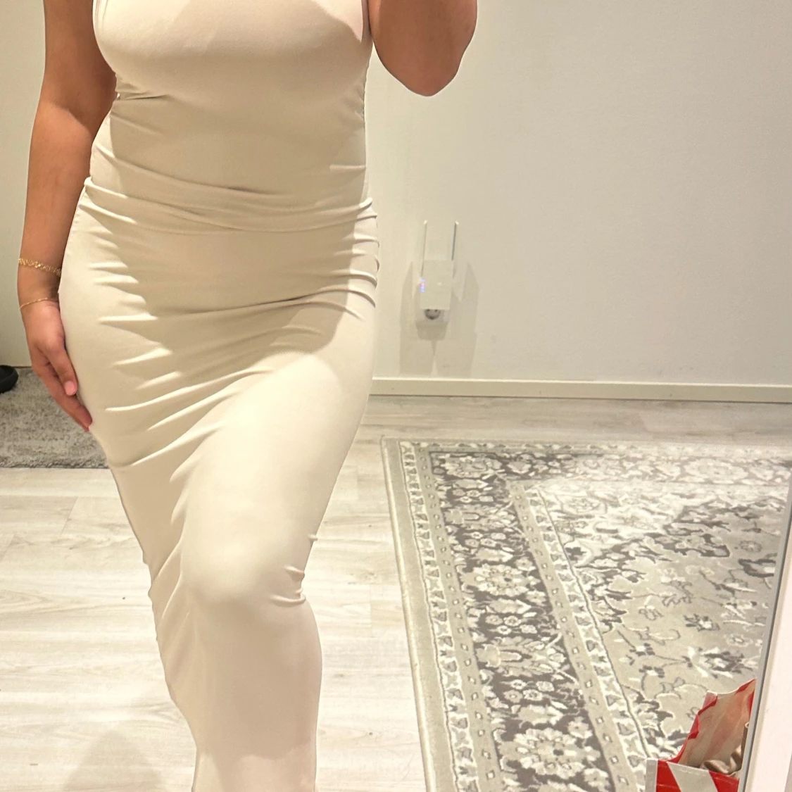 Säljer en stilren beige långklänning från SHEIN. Klänningen är ärmlös med figurnära passform och rund halsringning.