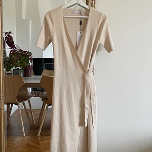Beige, stickad omlottklänning från NA-KD. Går till vaderna. Aldrig använd