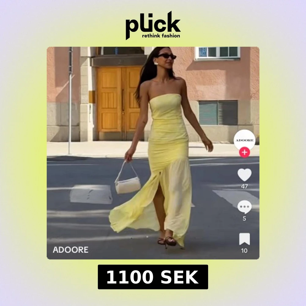 Säljer en ljusgul axelbandslös långklänning från Adoore. Klänningen har en figurnära passform upptill och faller mjukt nedtill med en asymmetrisk slits framtill. Perfekt för sommarens tillfällen.