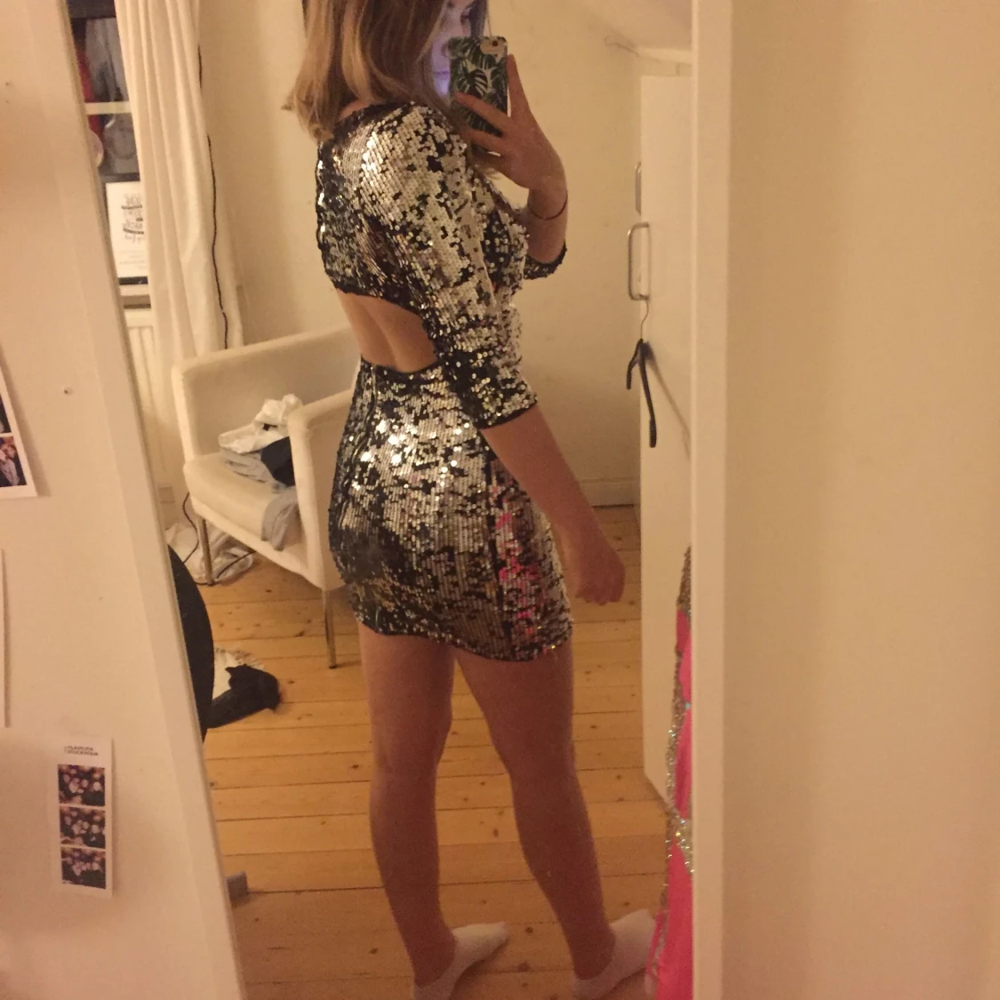 Klänning med silvriga och svarta paljetter, perfekt nu under festsäsongen! Snygg öppning i ryggen (där bh-n inte syns). Passar XS-S. Använd endast en gång.