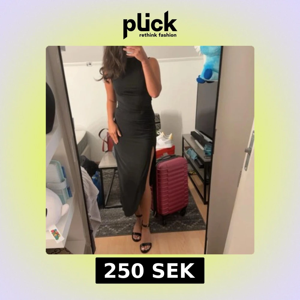 Säljer en svart långklänning med hög hals och ärmlös design. Klänningen har en tight passform och en snygg slits på sidan som ger en extra edge. Perfekt för dig som vill ha en stilren och elegant look.