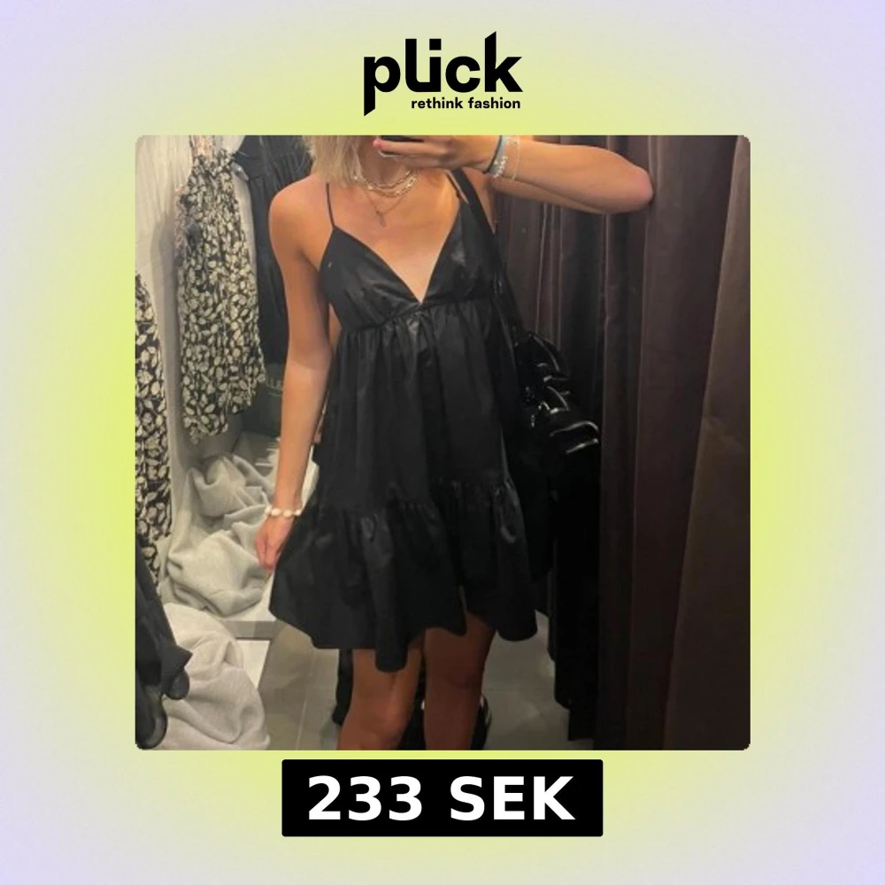 Supersöt svart kort klänning från bikbok med tunna axelband och v-ringning. Klänningen har en luftig passform, volangkant nertill och snygg snörning i ryggen. Perfekt för varma dagar och enkel att styla med smycken eller en cool väska.