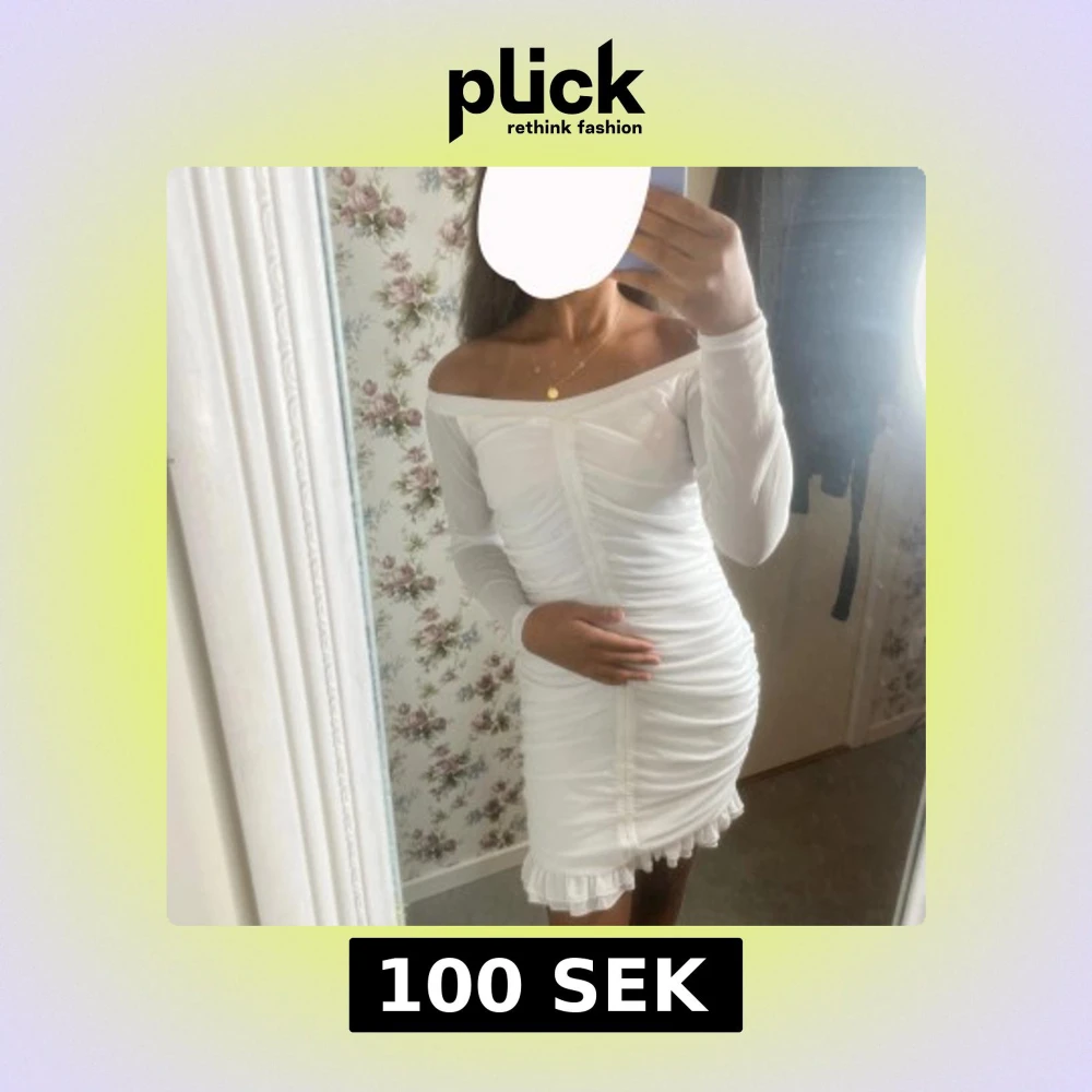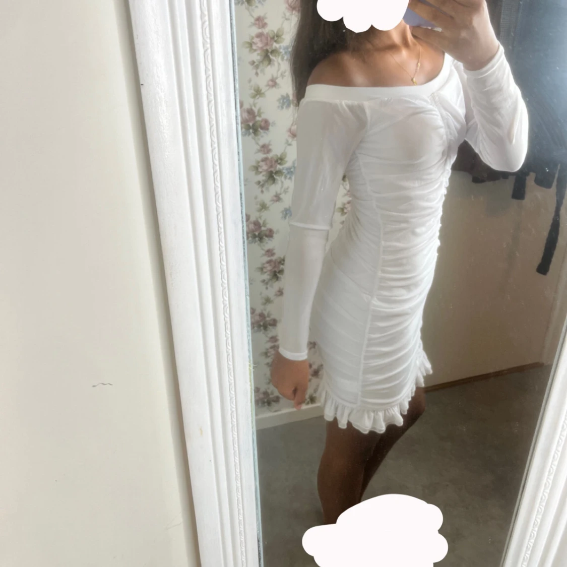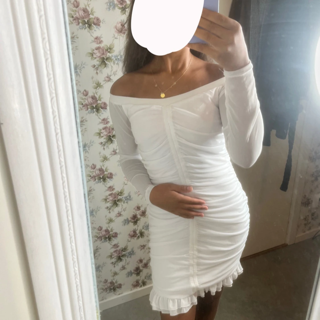 Säljer en vit kortklänning med offshoulder och långa ärmar. Klänningen har rynkade detaljer framtill och en söt volangkant nertill. Sitter tight och har en feminin siluett, perfekt för dig som vill sticka ut lite extra.