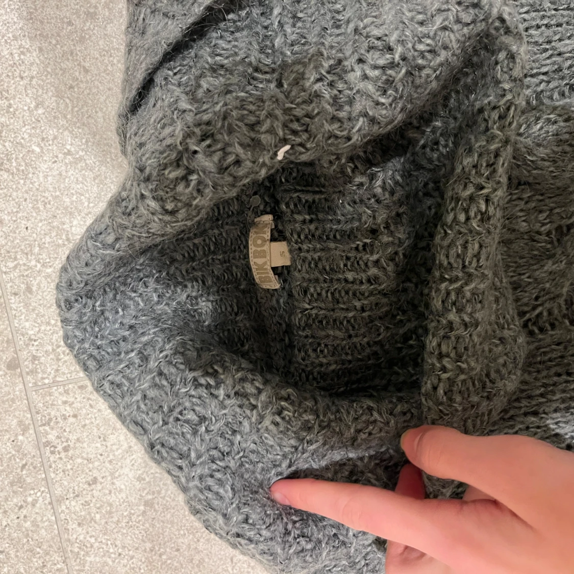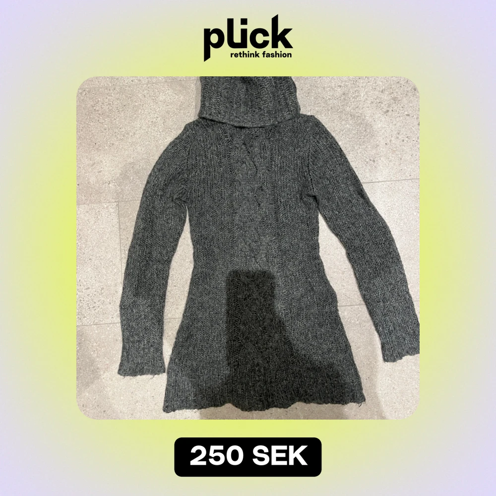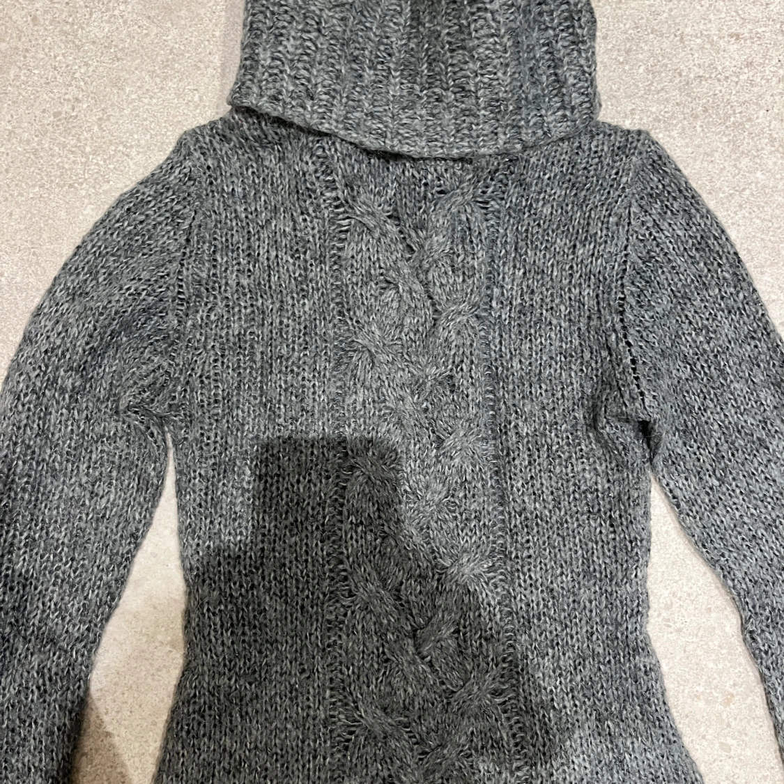 Mysig grå stickad poloklänning med kabelstickat mönster framtill.