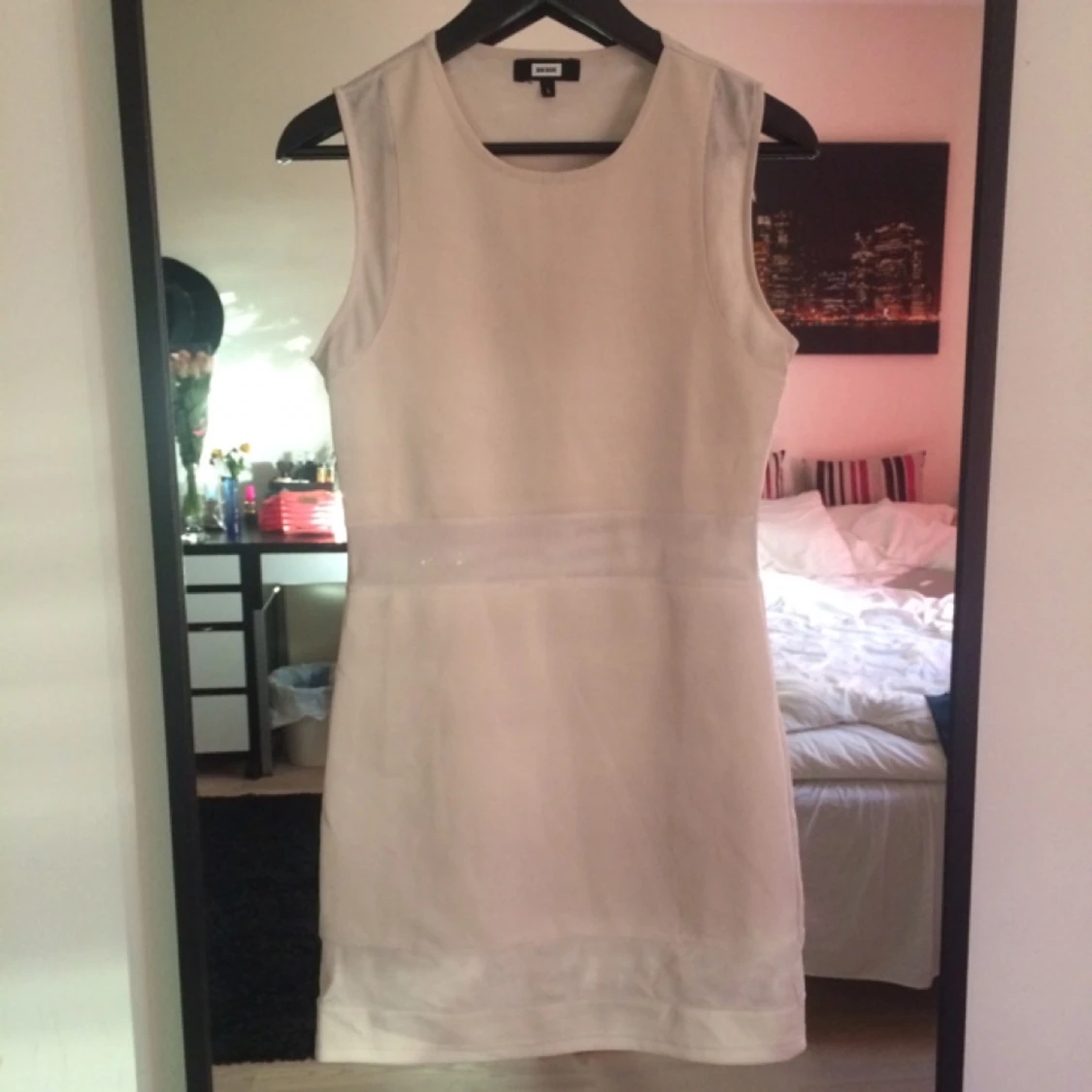 Tight ljusbeige klänning från BikBok med mesh detaljer vid ärmar, midja och ben.