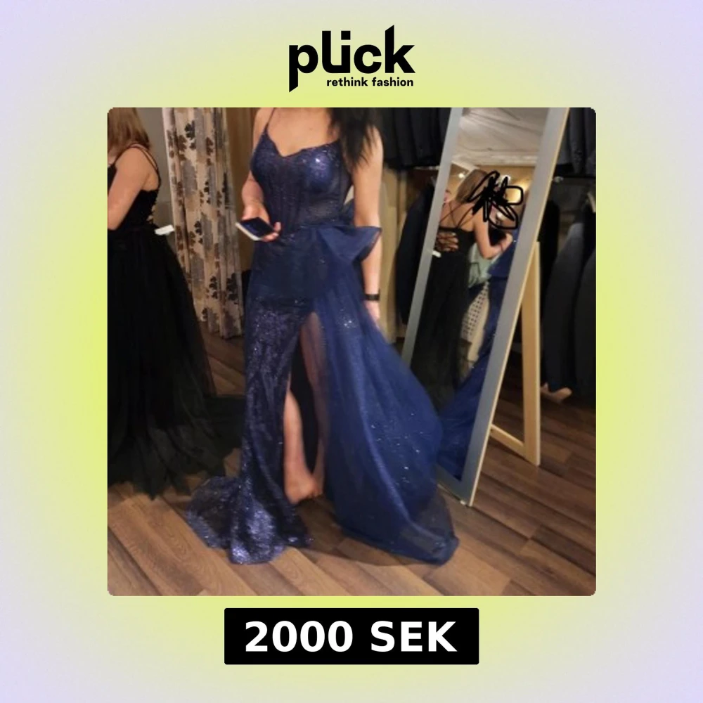 Elegant blå långklänning med glittrigt material och smala axelband. Klänningen har en slits framtill och en volangdetalj vid midjan som ger en extra touch av glamour.OBS! Volangdetaljen är avtagbar ‼️‼️