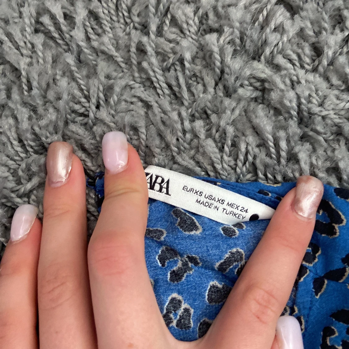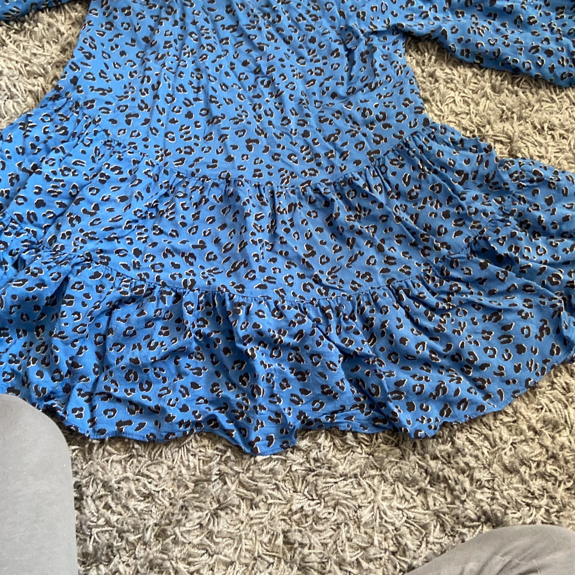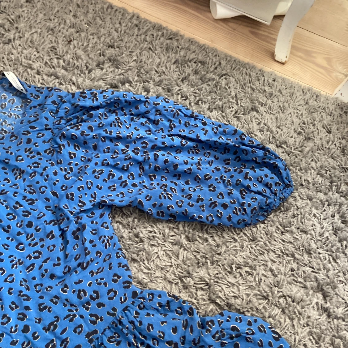 Säljer en blå kortklänning från Zara med leopardmönster. Klänningen har volangdetaljer, och puffiga långärmar. Perfekt för dig som vill sticka ut med ett djurmönster och gillar trendiga detaljer.