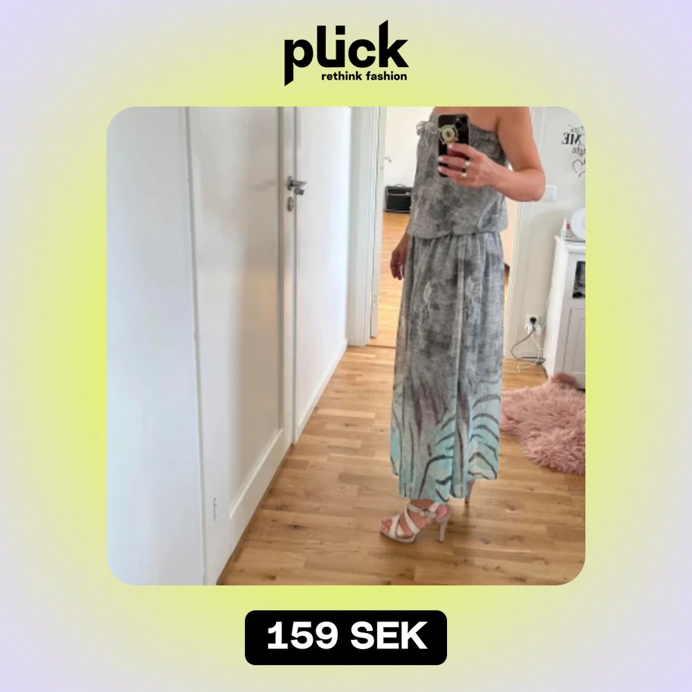 Säljer en superfin grå axelbandslös klänning med ett unikt mönster i botten som går i blå och grå toner. Klänningen har en loose passform och är perfekt för sommarens alla fester. Den har en volangdetalj upptill och är i ett mjukt material som känns skönt mot huden.