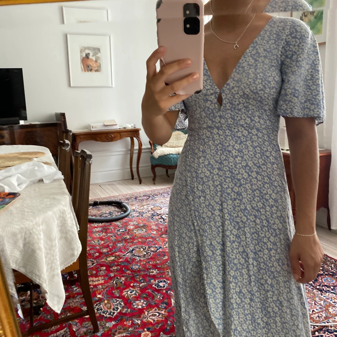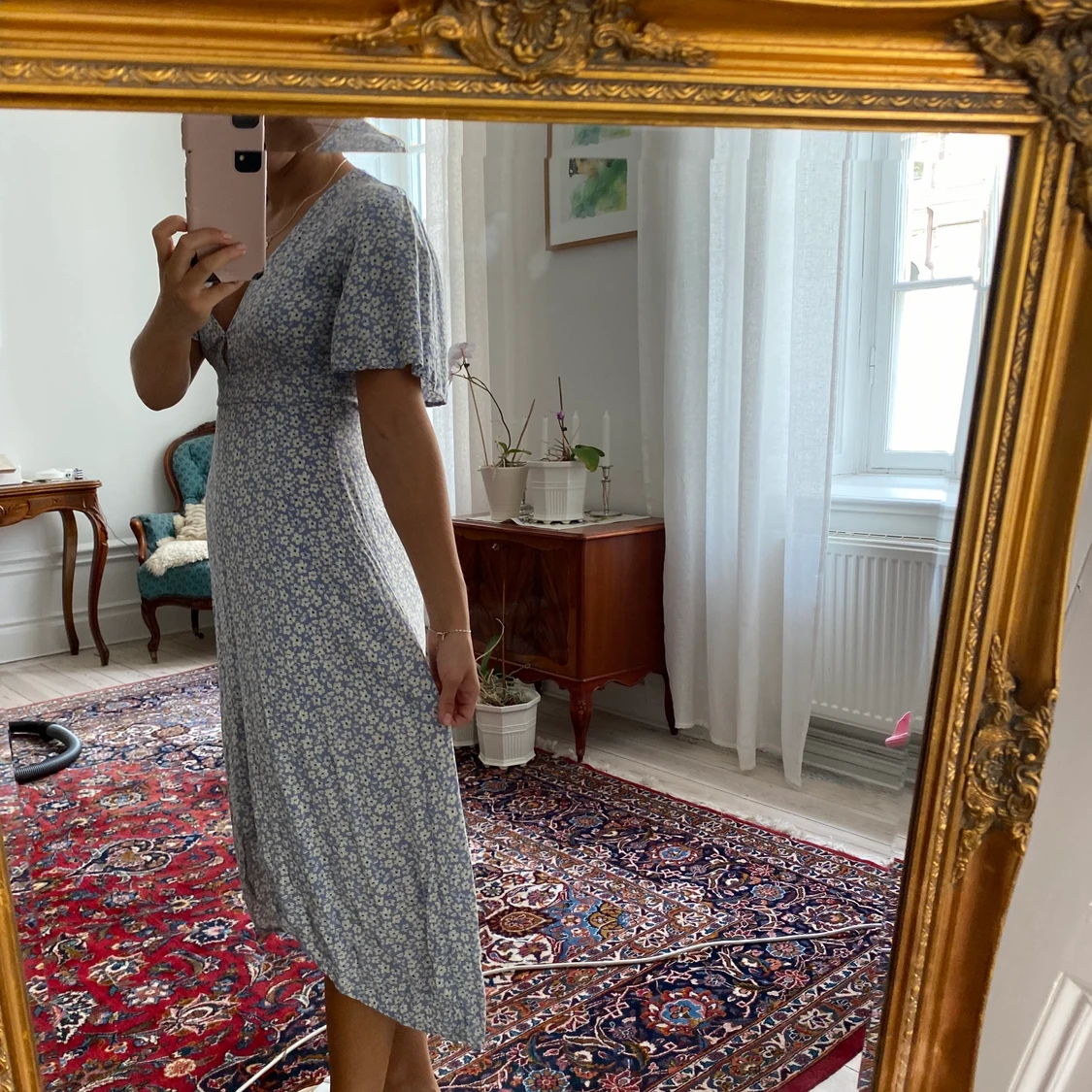 En blåblommig långklänning med slits i stl 34 köpt på Pull and Bear för något år sedan. Den är true to size. Inköpt för runt 350kr