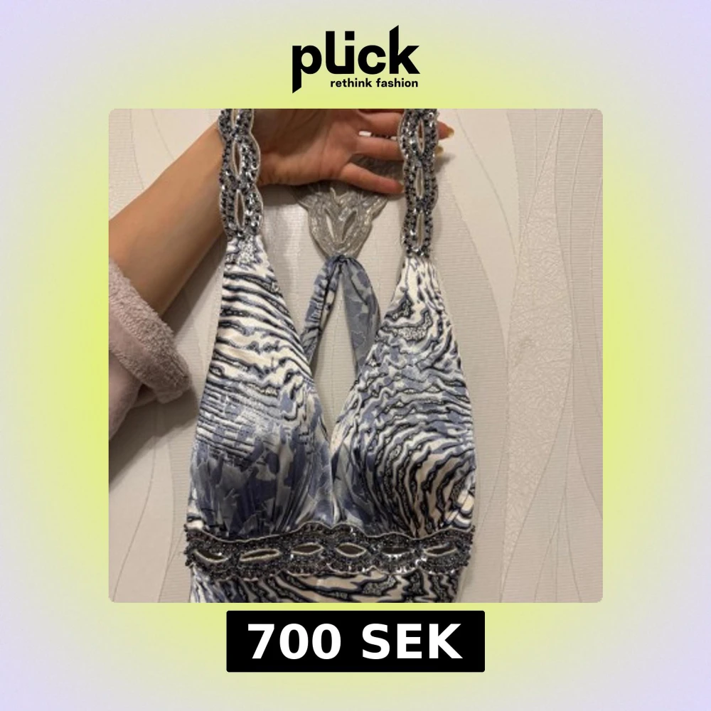 Säljer en elegant långklänning i blått och silver med tiger mönster. Klänningen har en djup v-ringning och dekorativa paljetter vid axelbanden och midjan med öppen rygg. Använd 2 gånger storlek 36/38 S/M skriv privat för fler bilder priset kan diskuteras