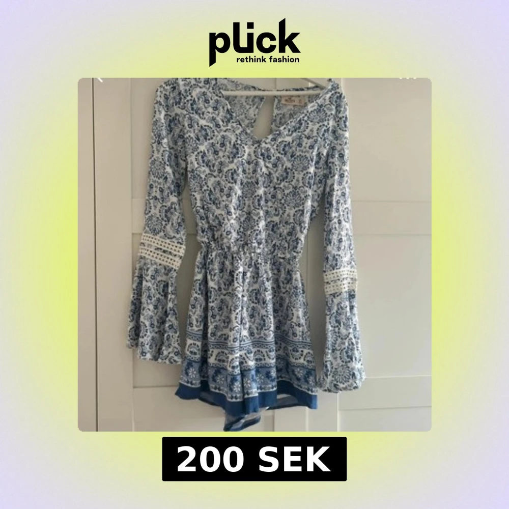 Supersöt blåvit kortklänning/jumpauit från Hollister med långärmade trumpetärmar och v-ringning. Klänningen har ett vackert blommigt mönster, markerad midja och spetsdetaljer på ärmarna. Perfekt för sommarens alla tillfällen!