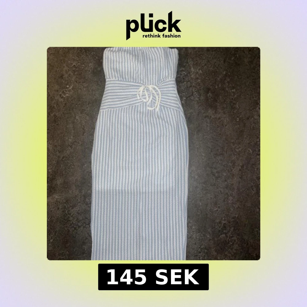 Supersöt bandeauklänning i blåvitt randigt med knyt i midjan och slits bak. Lång modell som sitter snyggt och har en fräsch sommarkänsla. Aldrig använd, har storlek M men upplevde att den var för liten