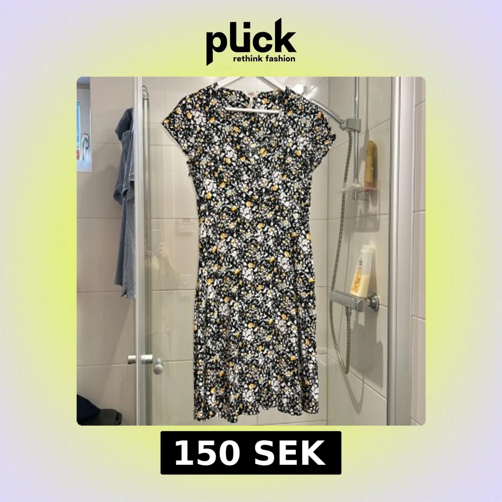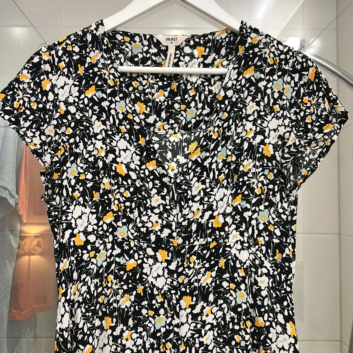 Säljer en söt blommig klänning från Object. Den har en svart bas med vita och gula blommor. Klänningen är kortärmad och har en rund halsringning. Perfekt för vår och sommar!