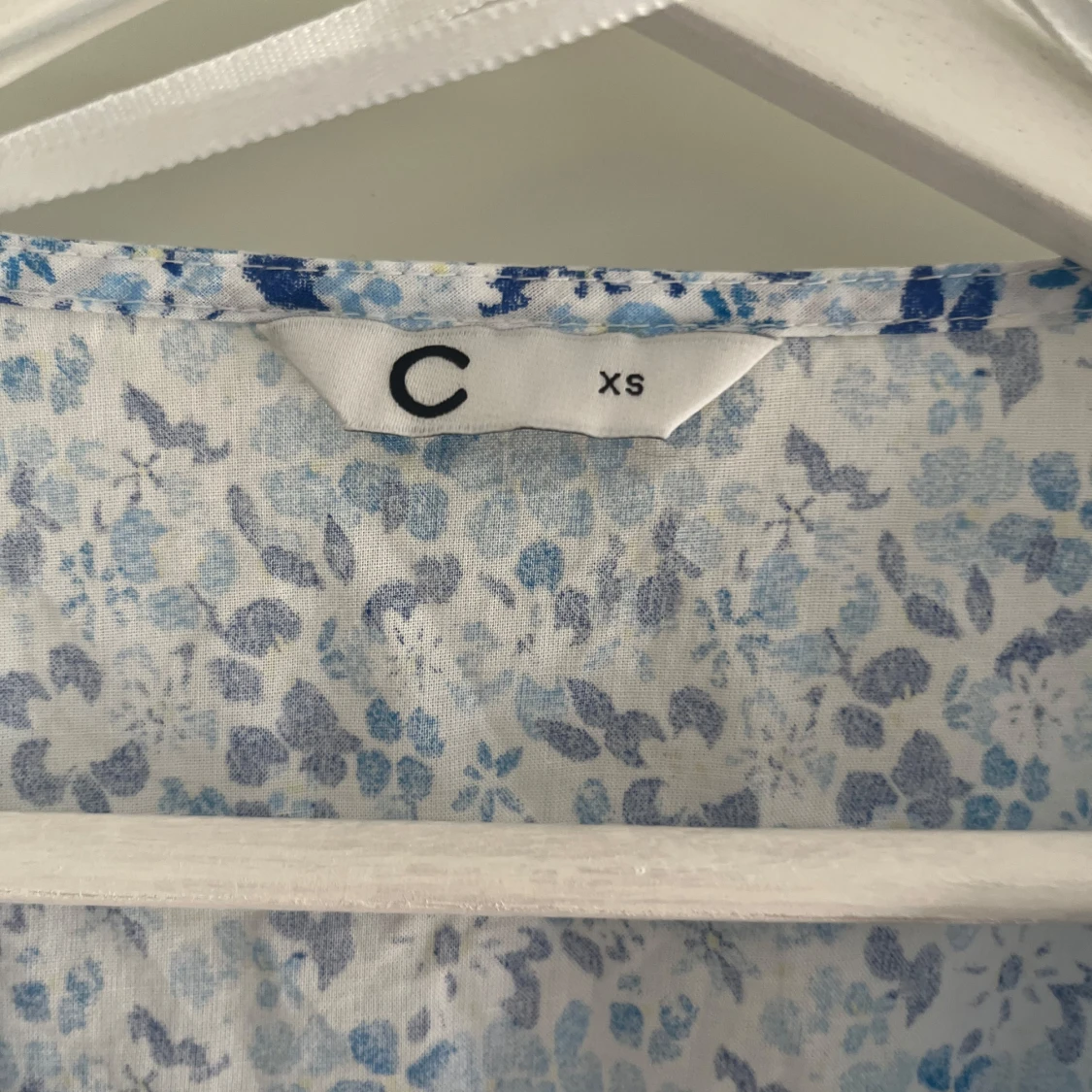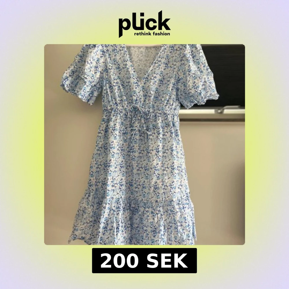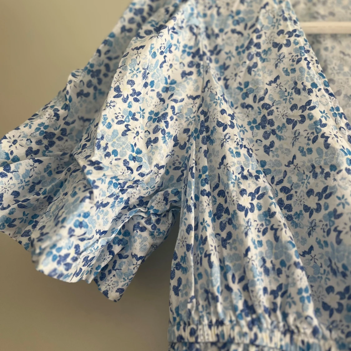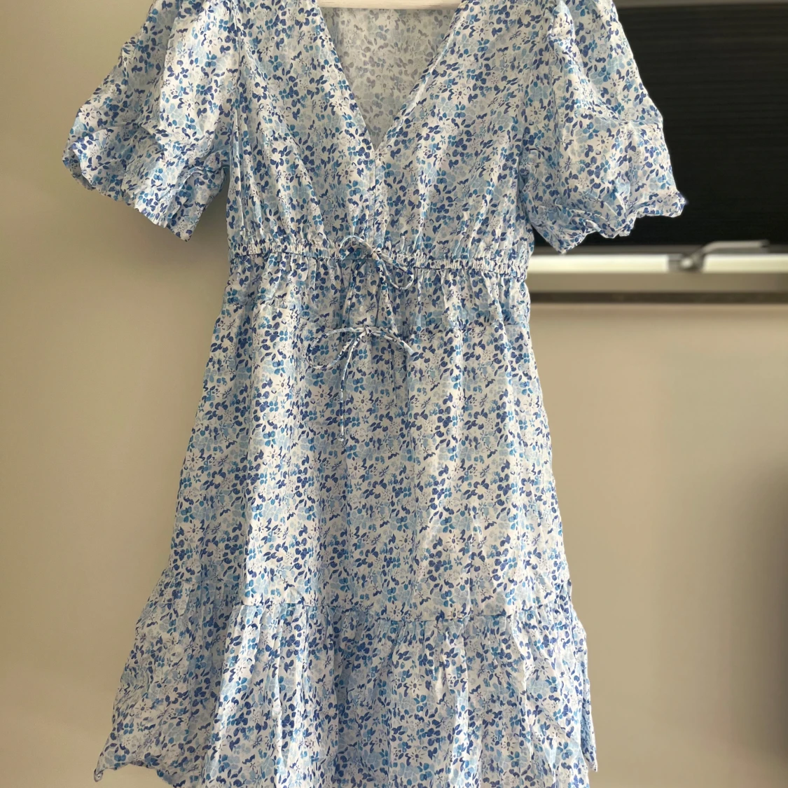 Supersöt kortklänning med blått blommönster från C. Klänningen har v-ringning, puffiga kortärmar och knyt i midjan. Perfekt för sommarens alla tillfällen och midsommar och har en luftig, flowy känsla. Säljer den på grund av att den är för liten för mig. Klänningen är i perfekt skick!