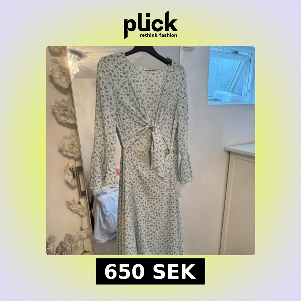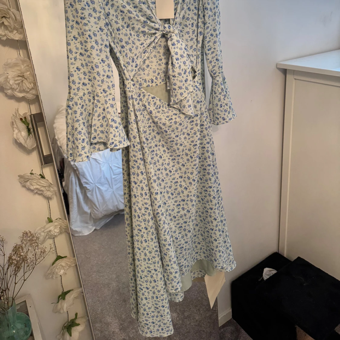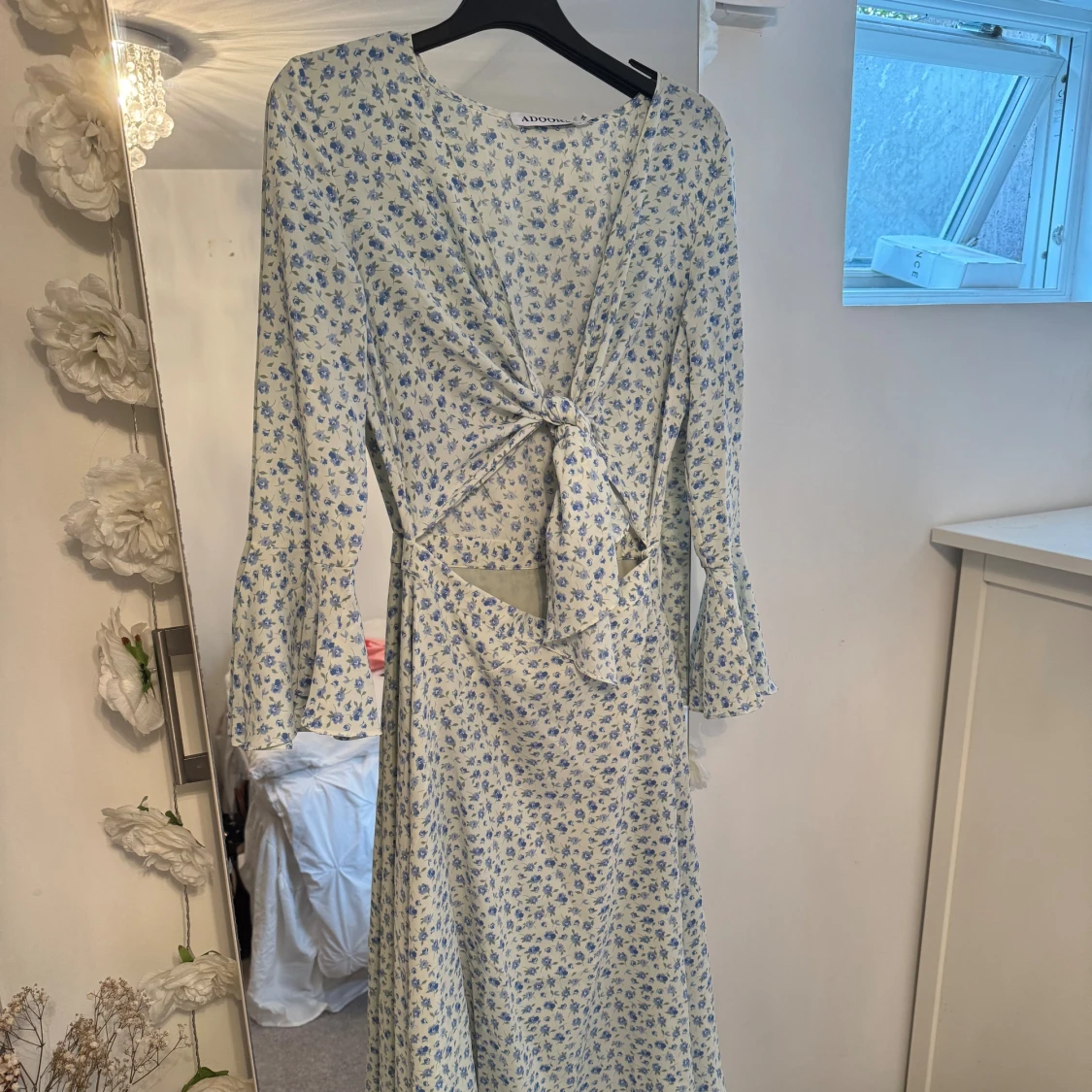 NY MED PRISLAPP, ENDAST TESTAD Supersöt långklänning med ljus botten och blått blommönster från ADOORE. Klänningen har långa trumpetärmar, knytning framtill och en liten cut-out vid midjan. Perfekt flowy passform och romantisk vibe.