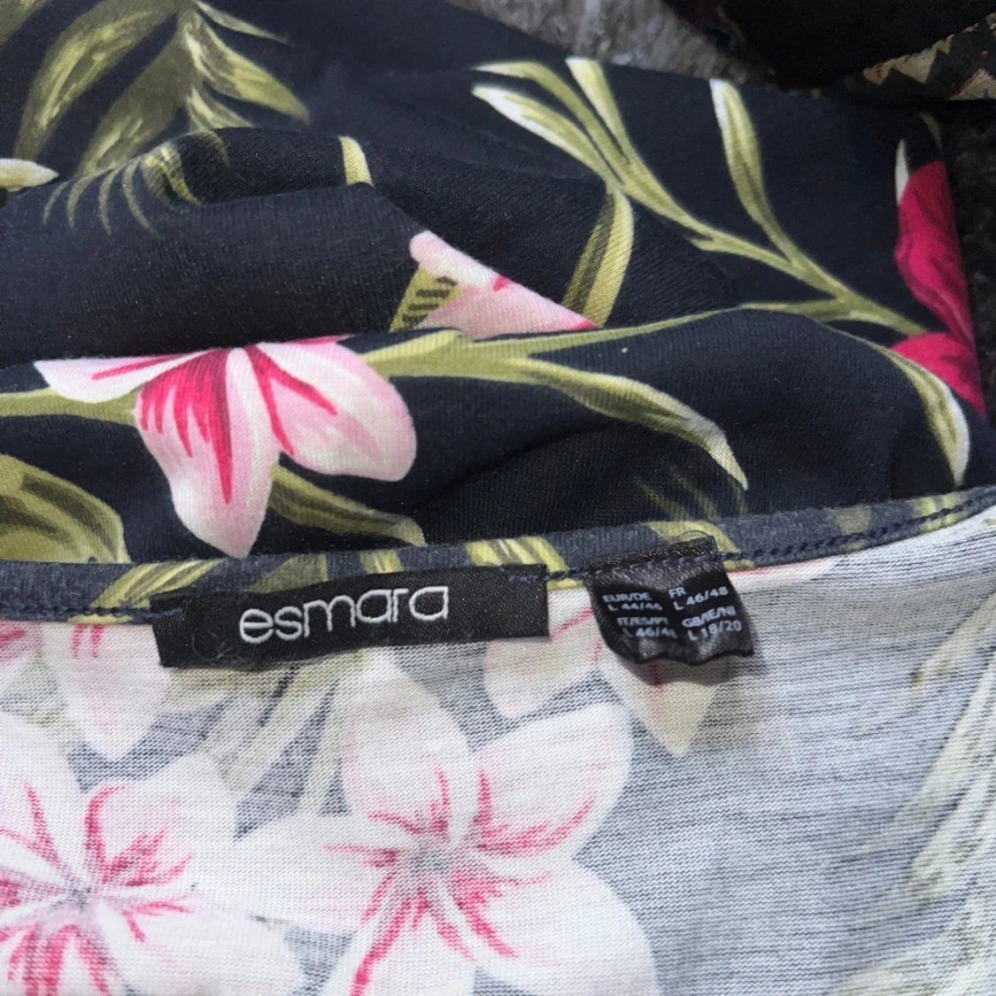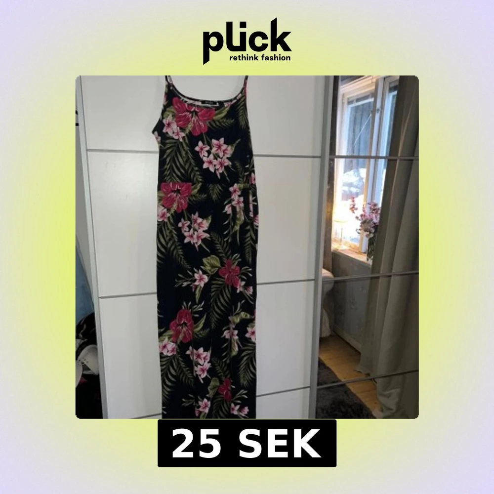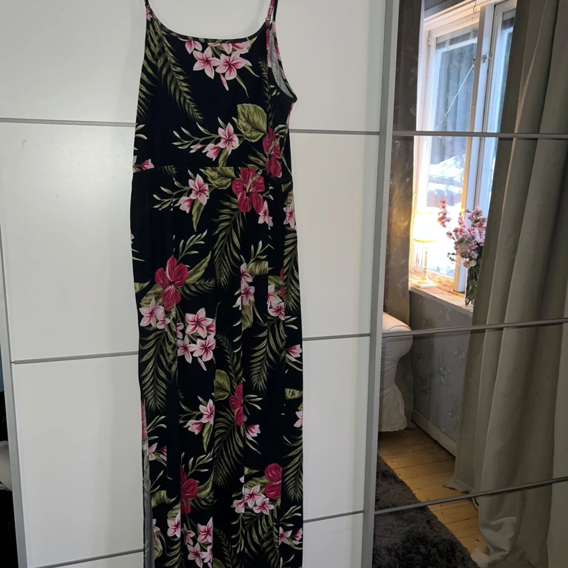 Snygg långklänning från Esmara med ett tropiskt blommönster i rosa och grönt på en mörkblå bakgrund. Klänningen har smala axelband och en avslappnad passform, perfekt för varma dagar.