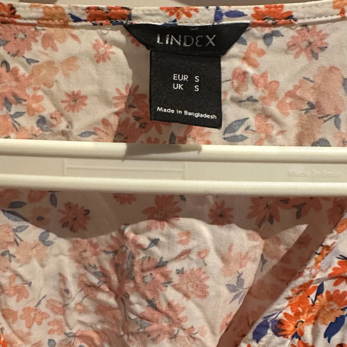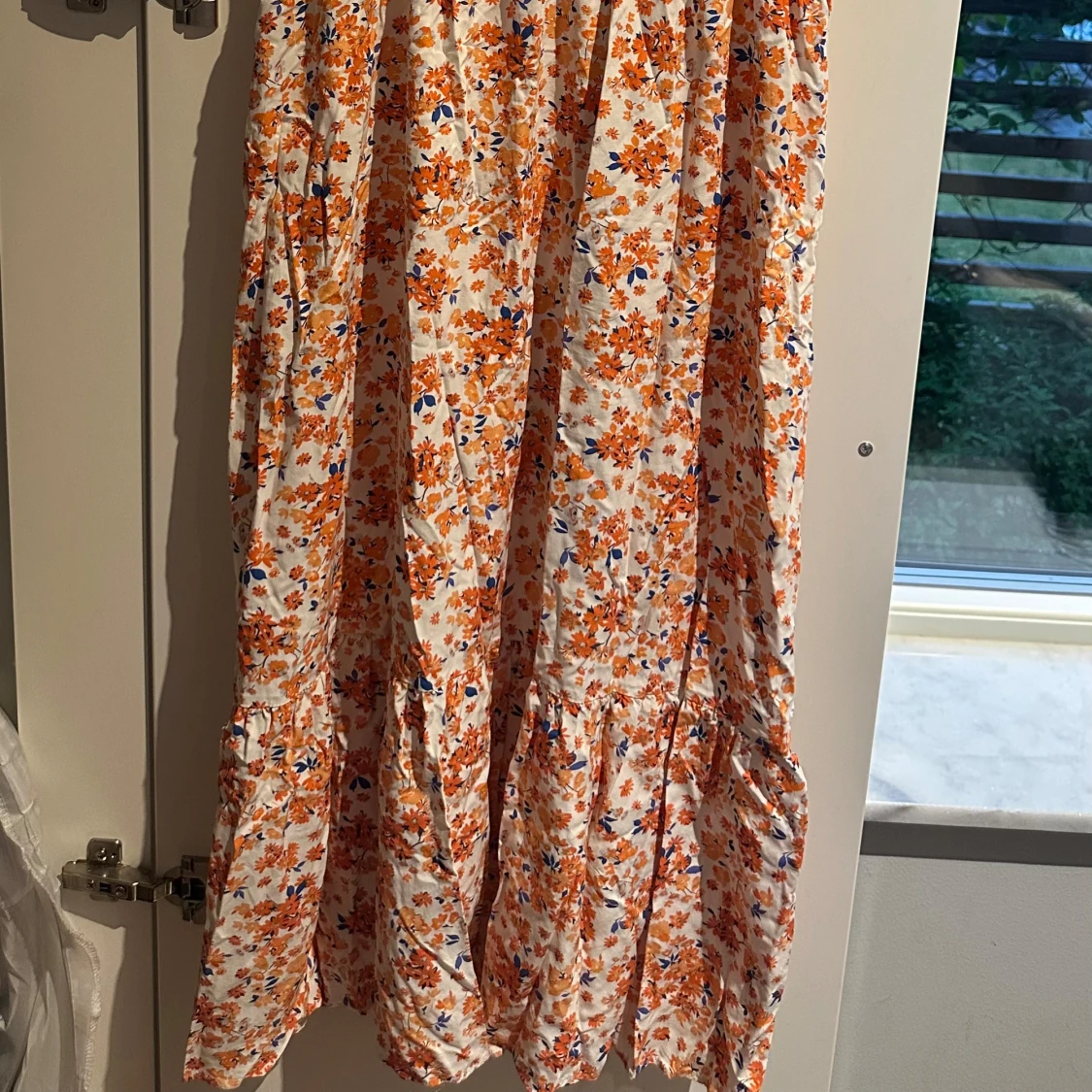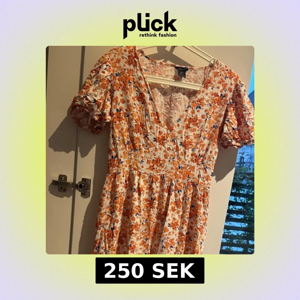 Superfin långklänning från Lindex med blommigt mönster i orange, blått och vitt. Klänningen har v-ringning, korta puffärmar och volangdetalj nertill. Perfekt för sommarens alla tillfällen och riktigt skön i lätt bomull.