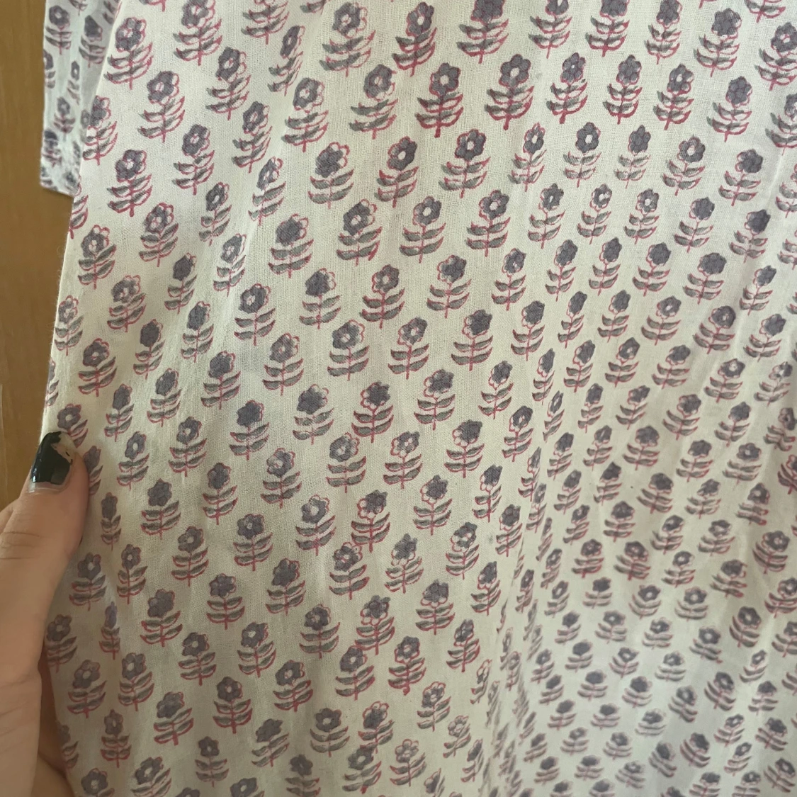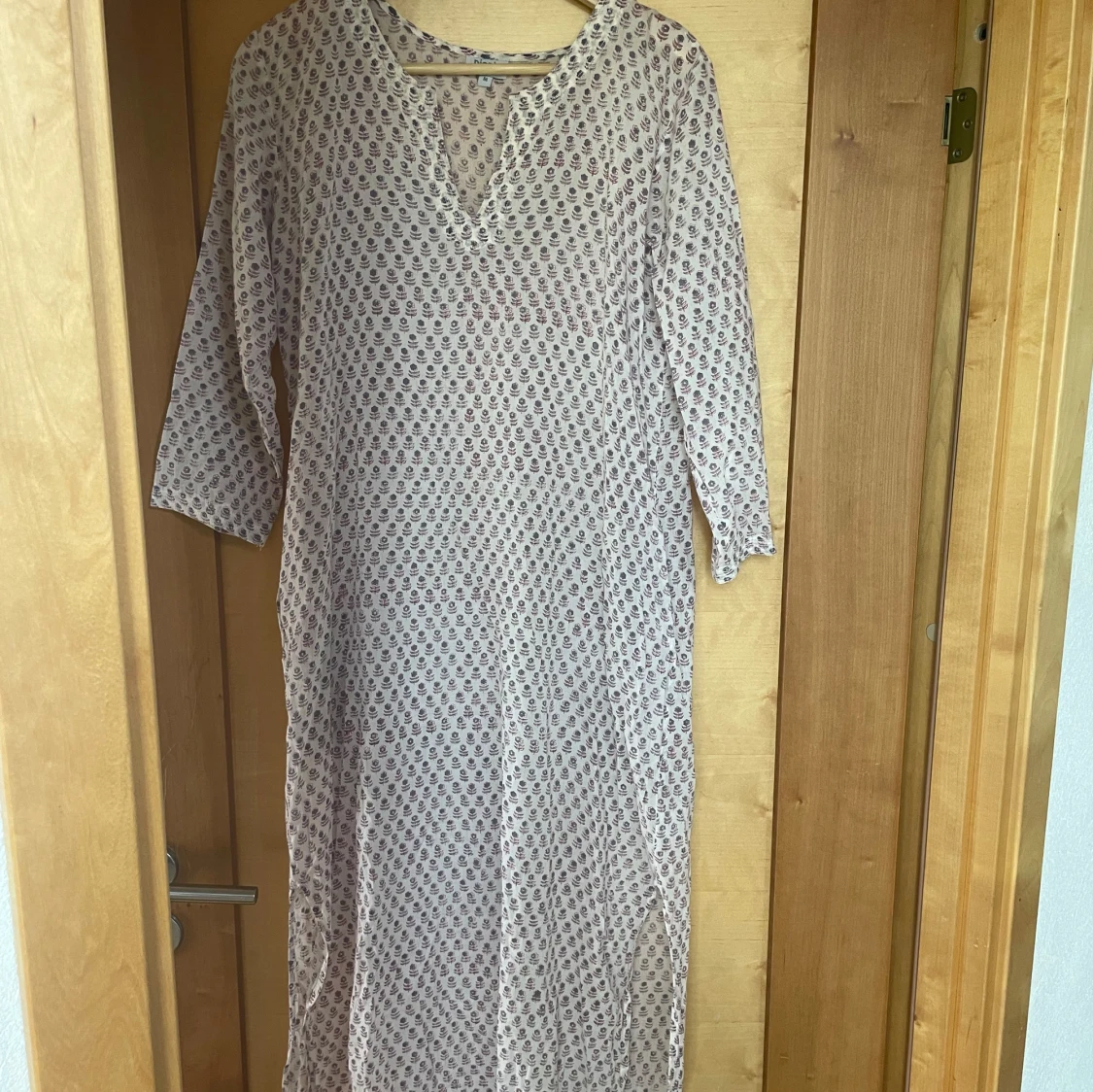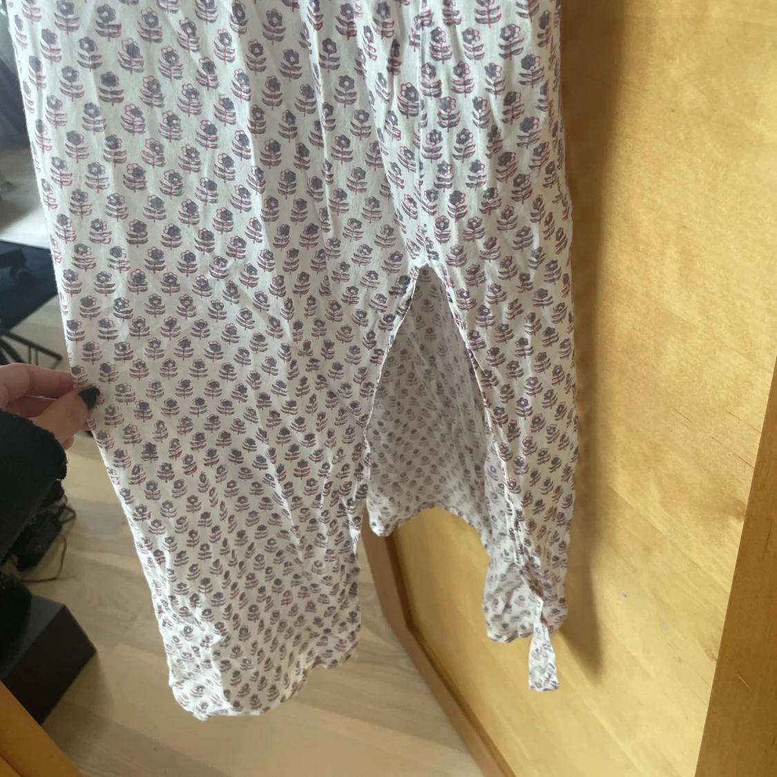 Luftig långklänning/nattlinne från Picok i vitt med små blommiga mönster i rött och blått. Klänningen har v-ringning och trekvartsärm, perfekt för varma dagar. Tillverkad i tunn bomull som känns sval och skön. Varan är aldrig använd men saknar prislapp