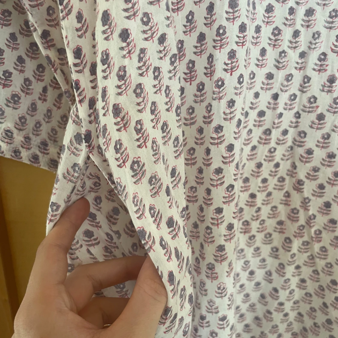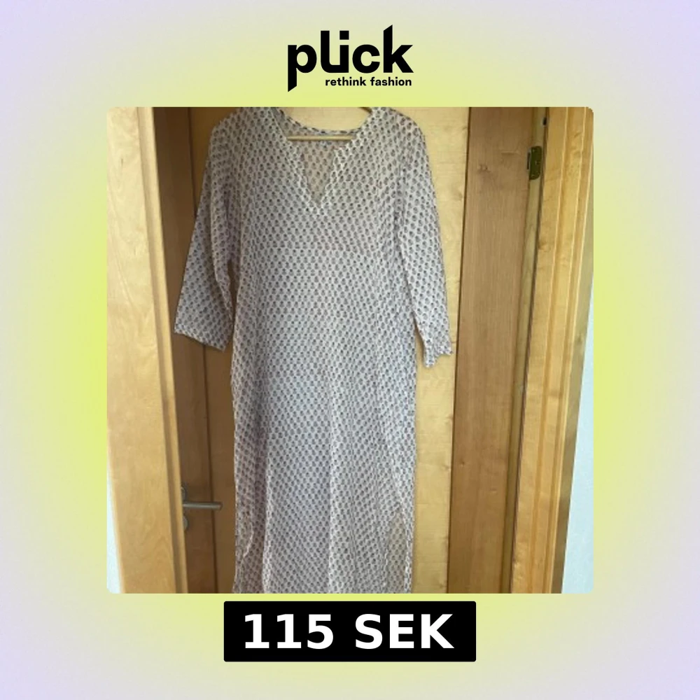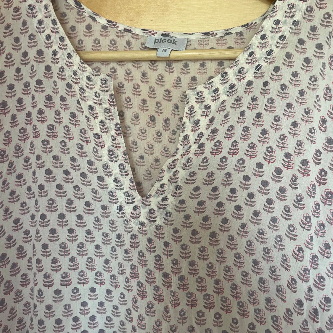 Luftig långklänning/nattlinne från Picok i vitt med små blommiga mönster i rött och blått. Klänningen har v-ringning och trekvartsärm, perfekt för varma dagar. Tillverkad i tunn bomull som känns sval och skön. Varan är aldrig använd men saknar prislapp