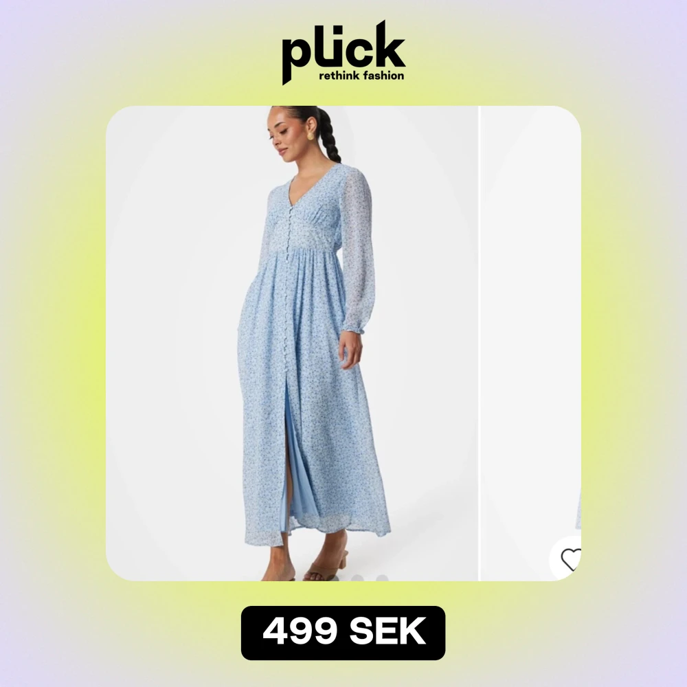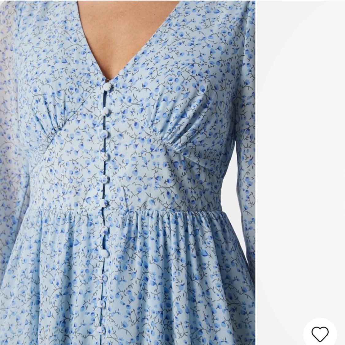Superfin långklänning i ljusblått med små blommor. Den har en v-ringad hals och knappar framtill. Ärmarna är långa och lite transparenta. Använd 1 gång