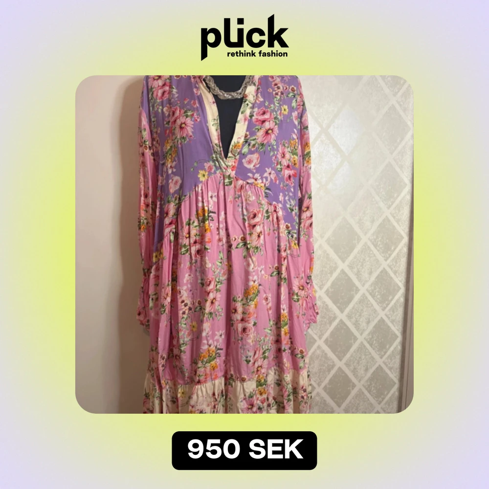 Charmig långklänning med blommigt mönster i rosa och lila nyanser. Klänningen har långa ärmar och en v-ringad hals. Perfekt för en bohemisk look med volanger och mjukt fall.