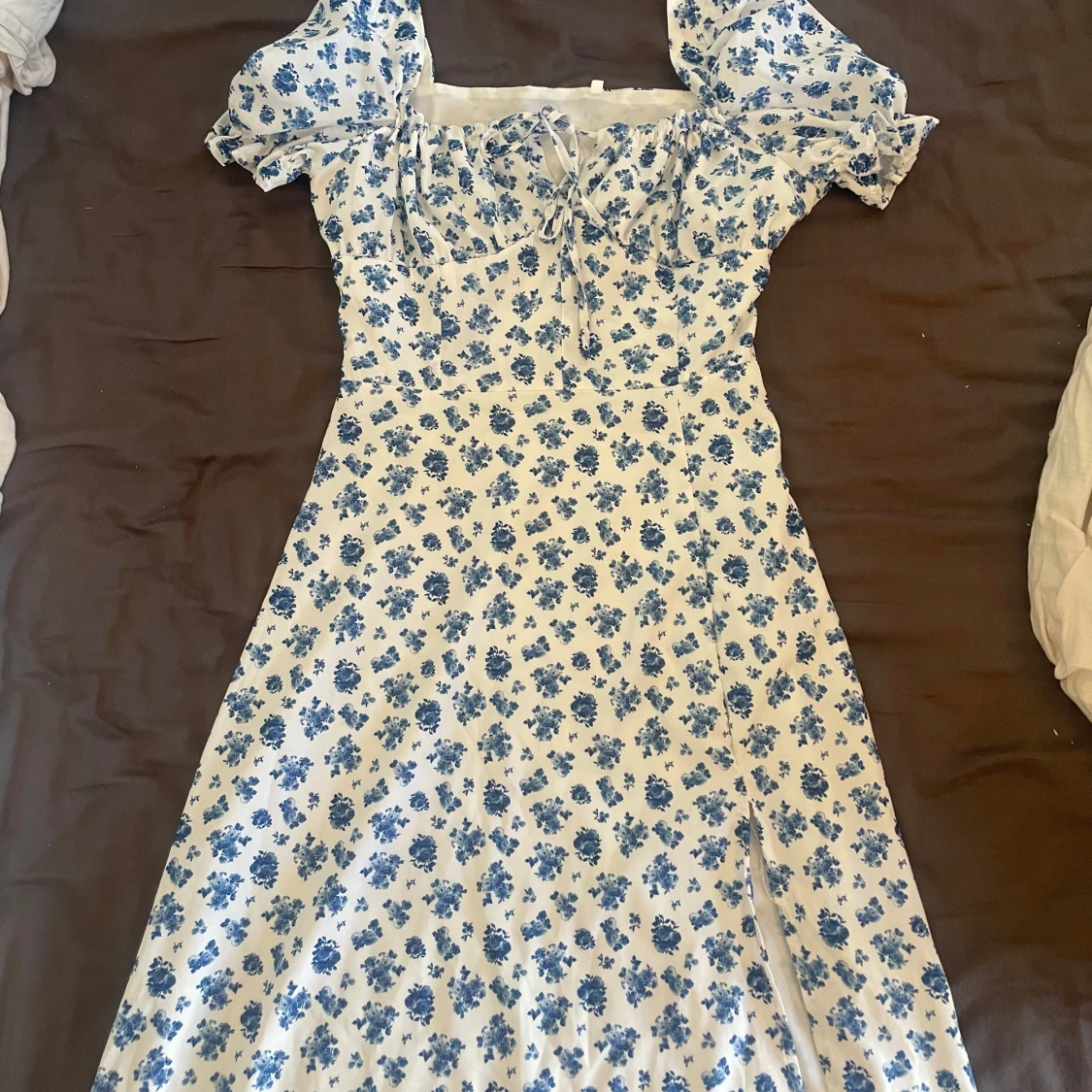 Superfin långklänning i vitt med blått blommönster, puffärmar och söt snörning vid bysten. Klänningen har en snygg slits på sidan!