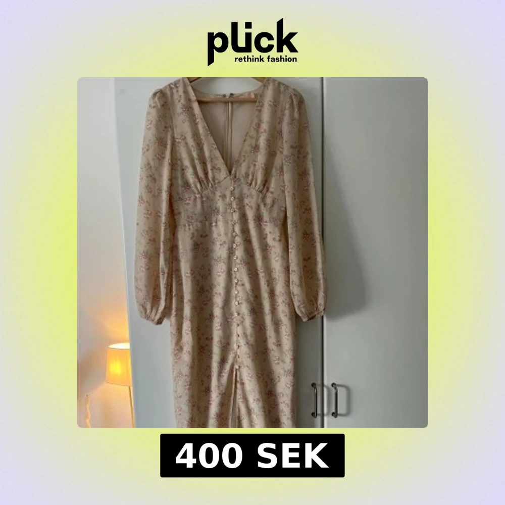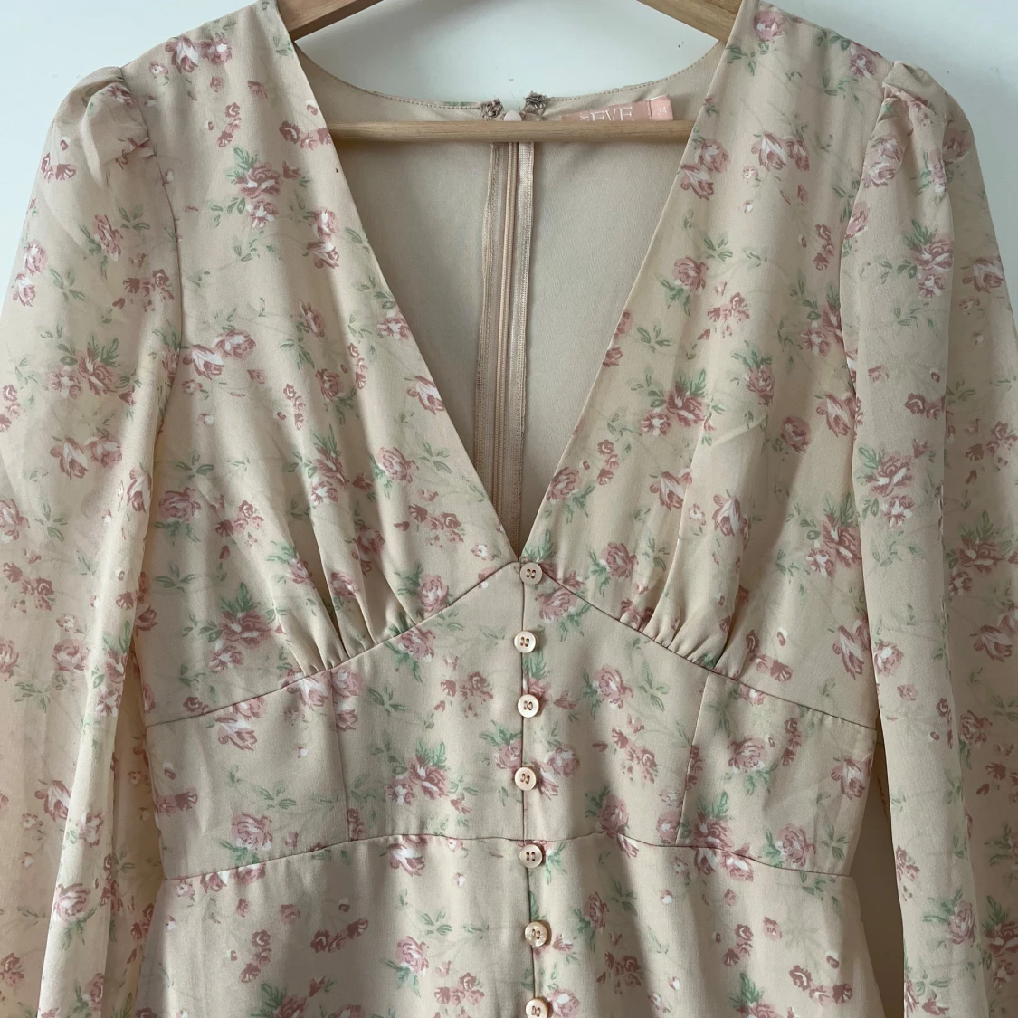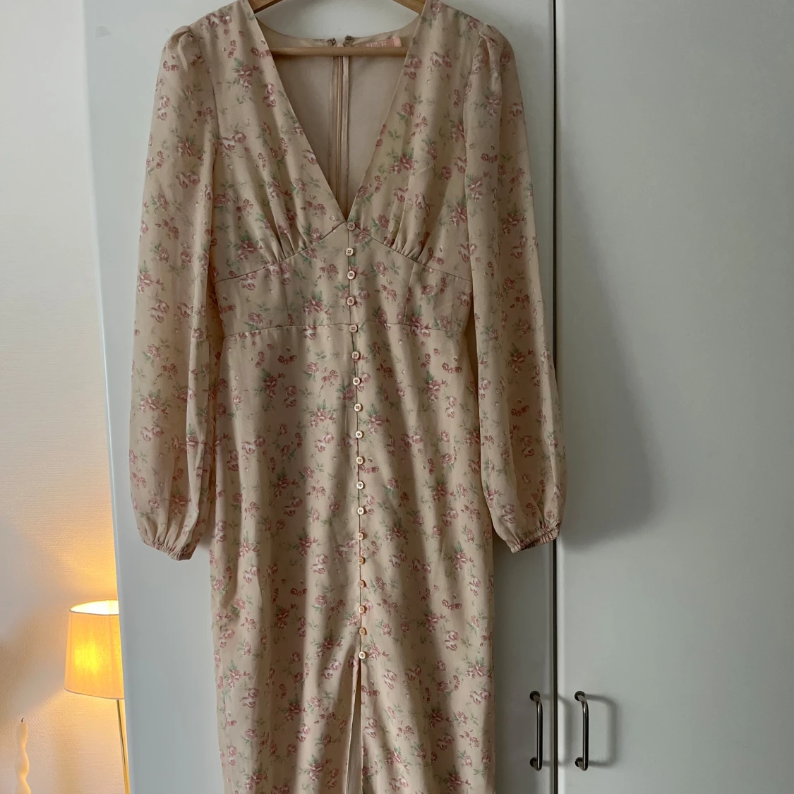 Romantisk långklänning i ljusbeige med blommigt mönster i rosa och grönt. Djup v-ringning, långa ärmar och knappar framtill. Klänningen har en feminin siluett och lätt puffade axlar.🩷