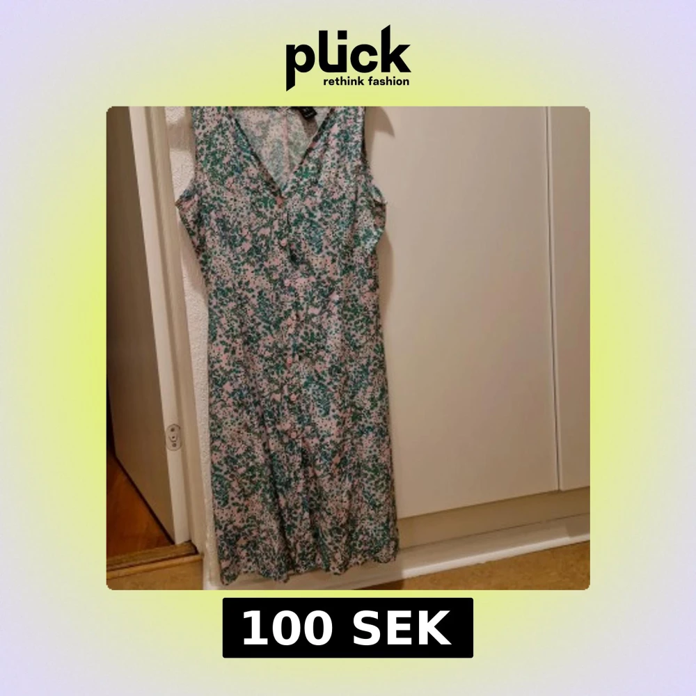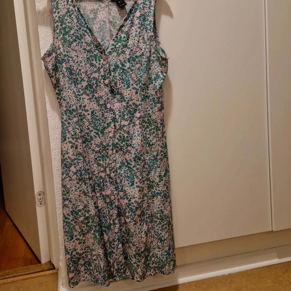 Supersöt blommig klänning från Lindex i storlek S. Den är ljusrosa med grönt blommönster, har v-ringning, knappar framtill och är ärmlös. Perfekt för varma dagar och har en skön, luftig passform som ger en chill vibe.